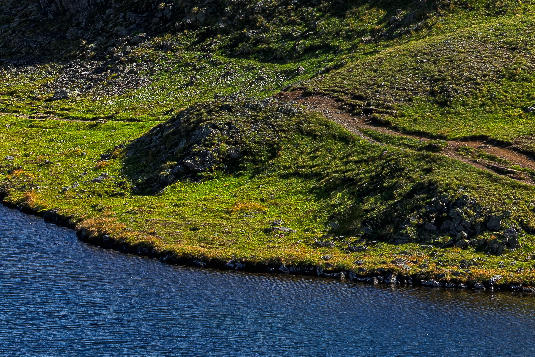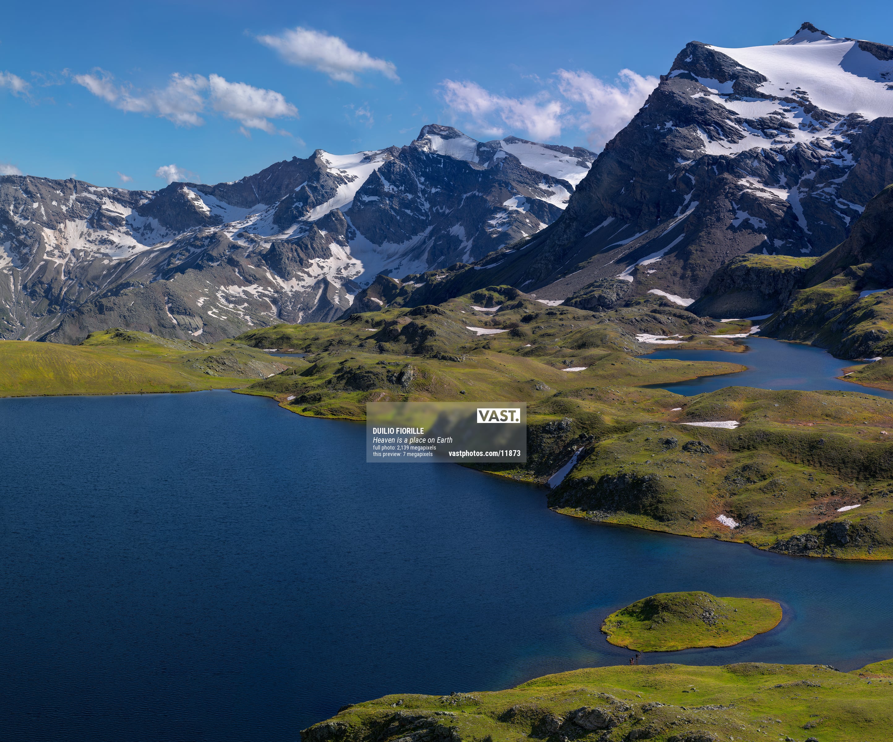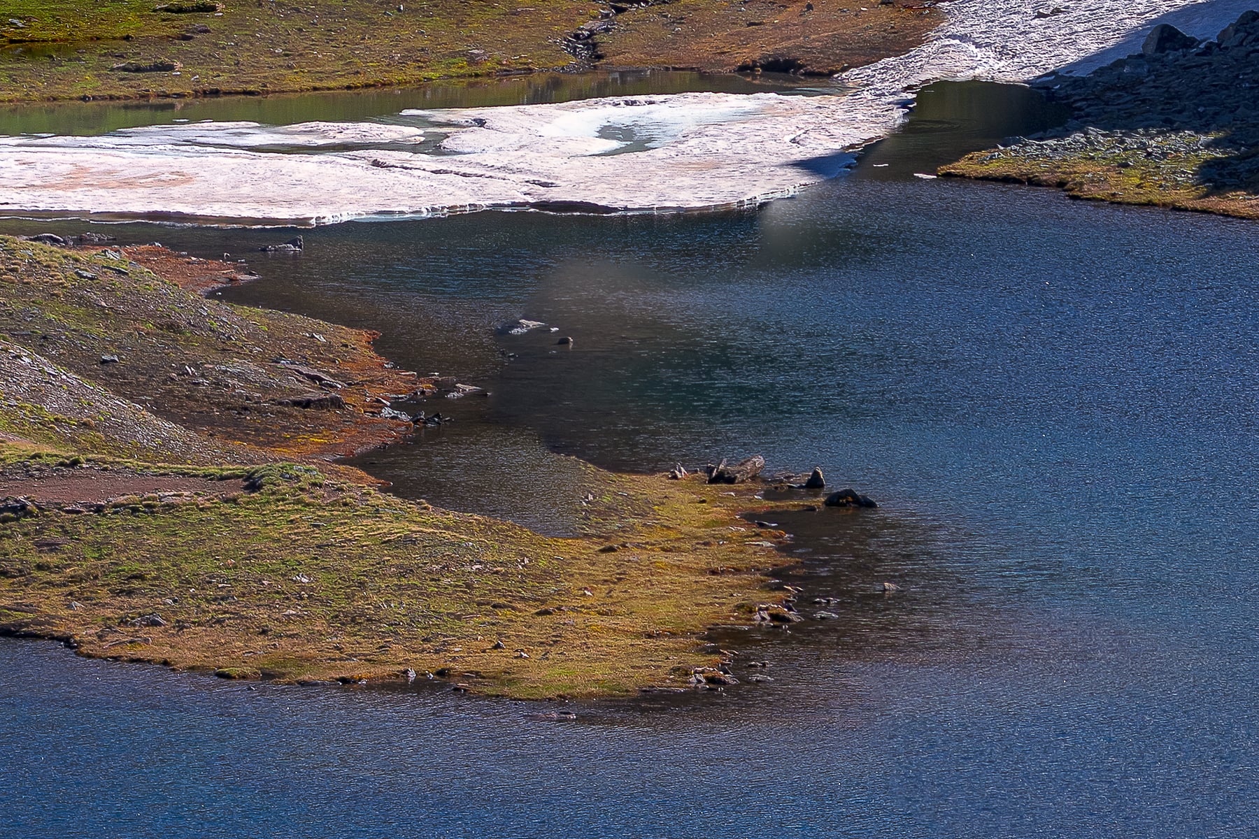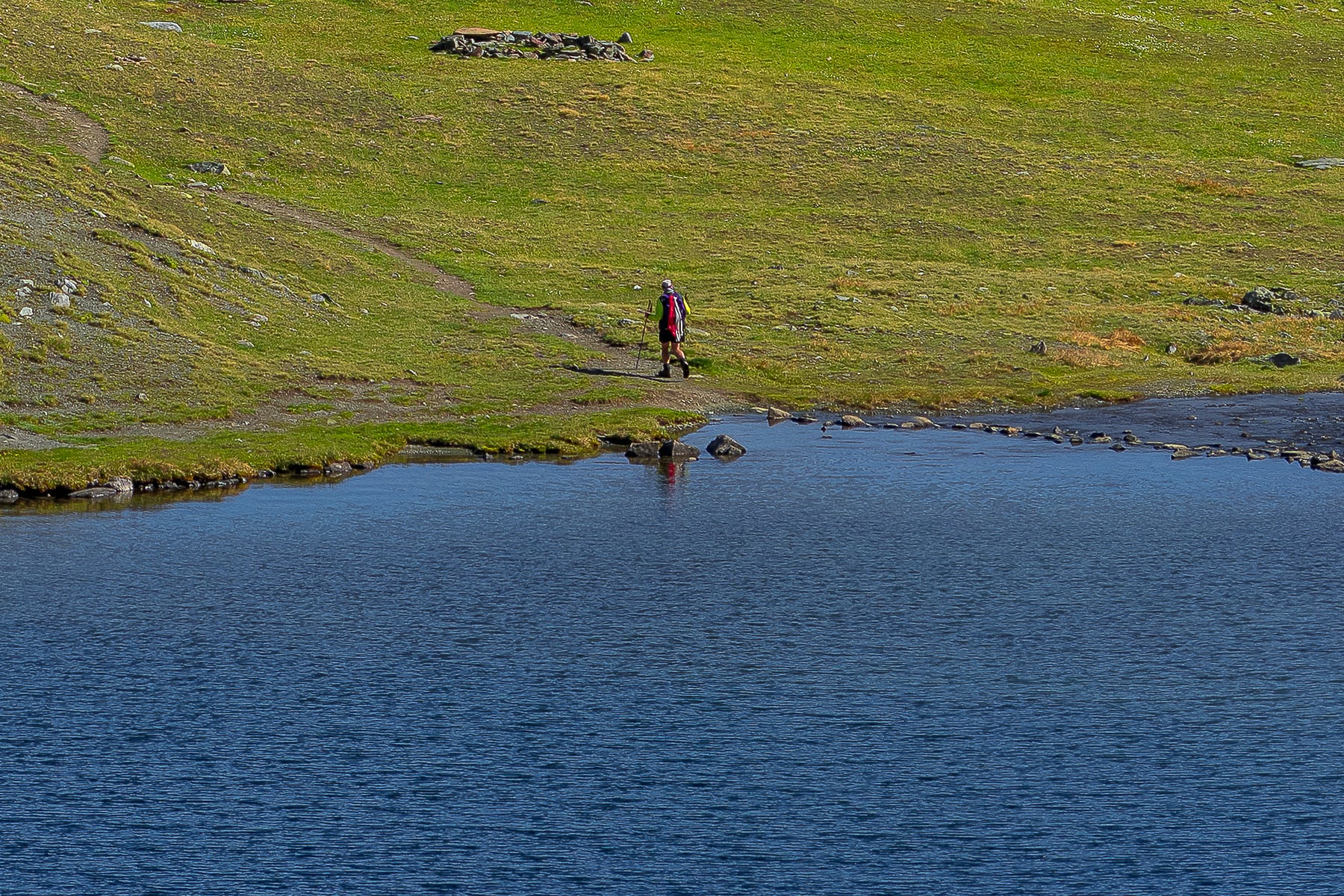 The observation point I chose to create my image allows you to see the entire wonderful lake of Rosset, located at 2701 meters above sea level, which has the particularity of possessing a small islet, located a very short distance from the shore, in the northern part, and connected by a rocky ford (in the photo you will see some hikers crossing it).