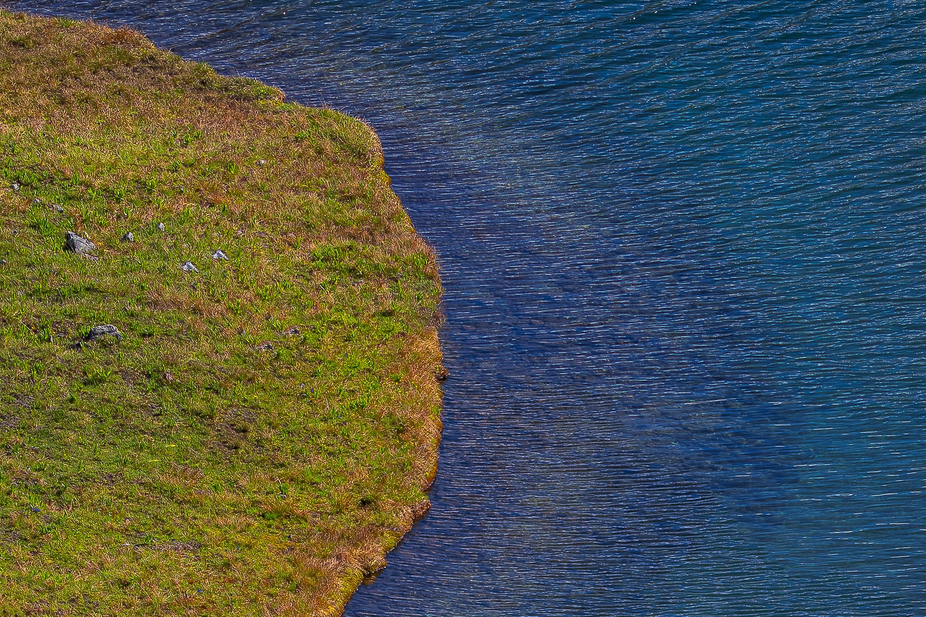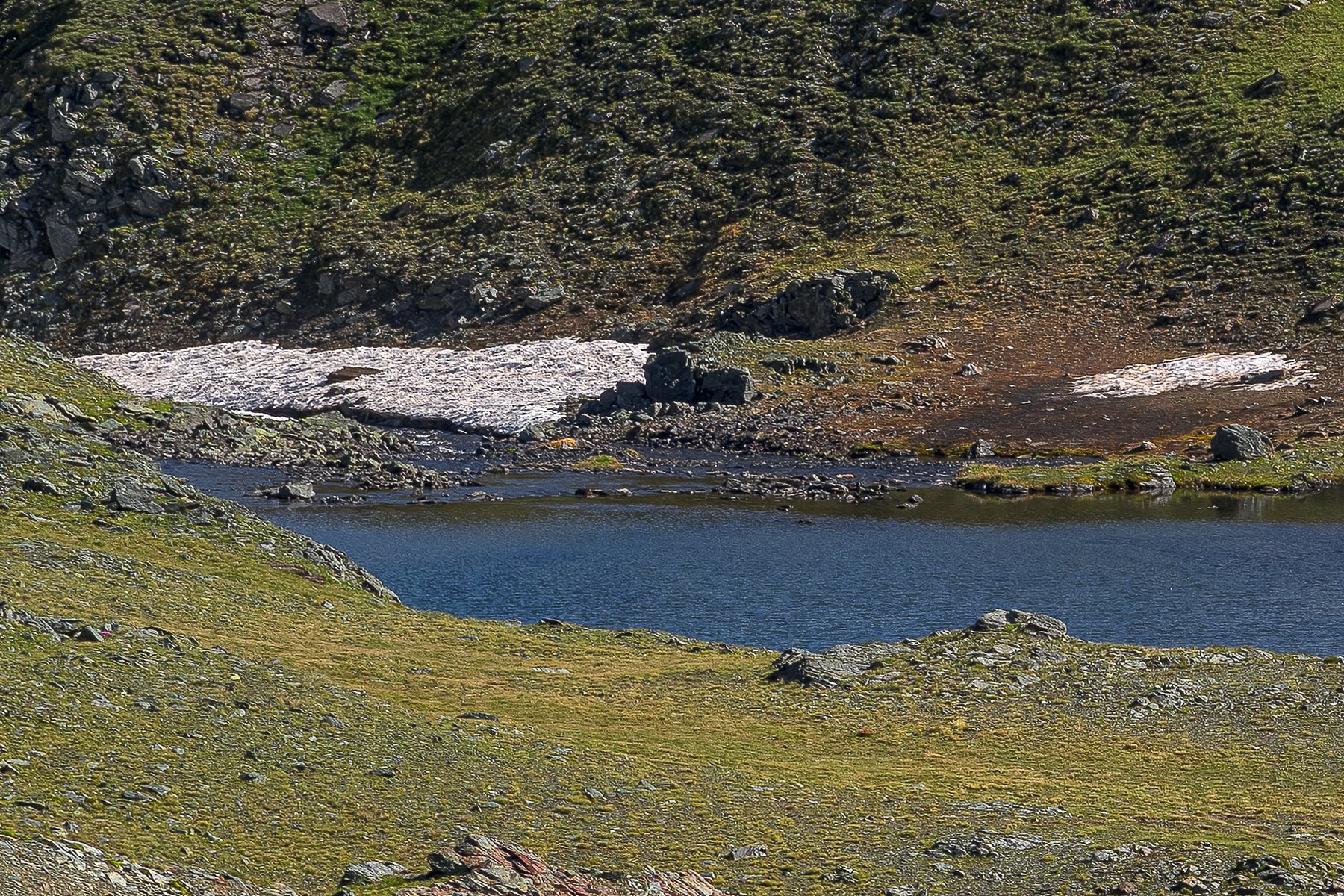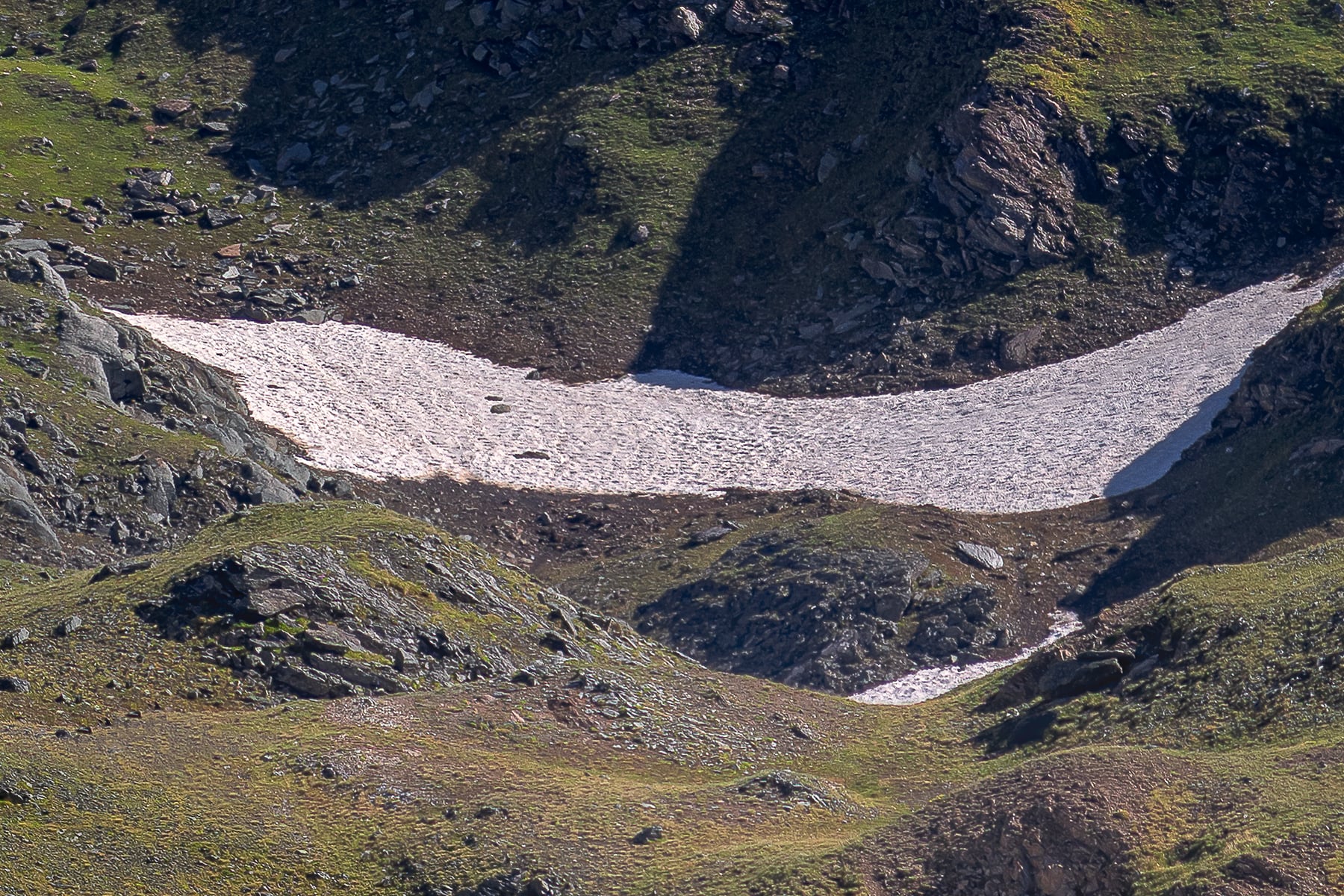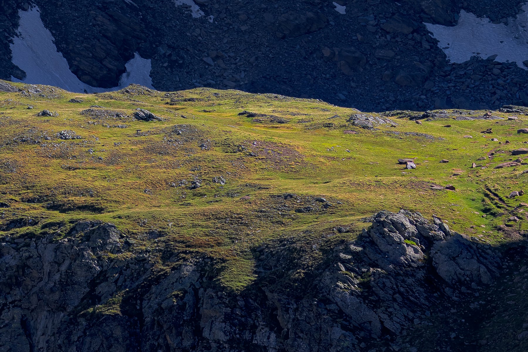 The observation point I chose to create my image allows you to see the entire wonderful lake of Rosset, located at 2701 meters above sea level, which has the particularity of possessing a small islet, located a very short distance from the shore, in the northern part, and connected by a rocky ford (in the photo you will see some hikers crossing it).