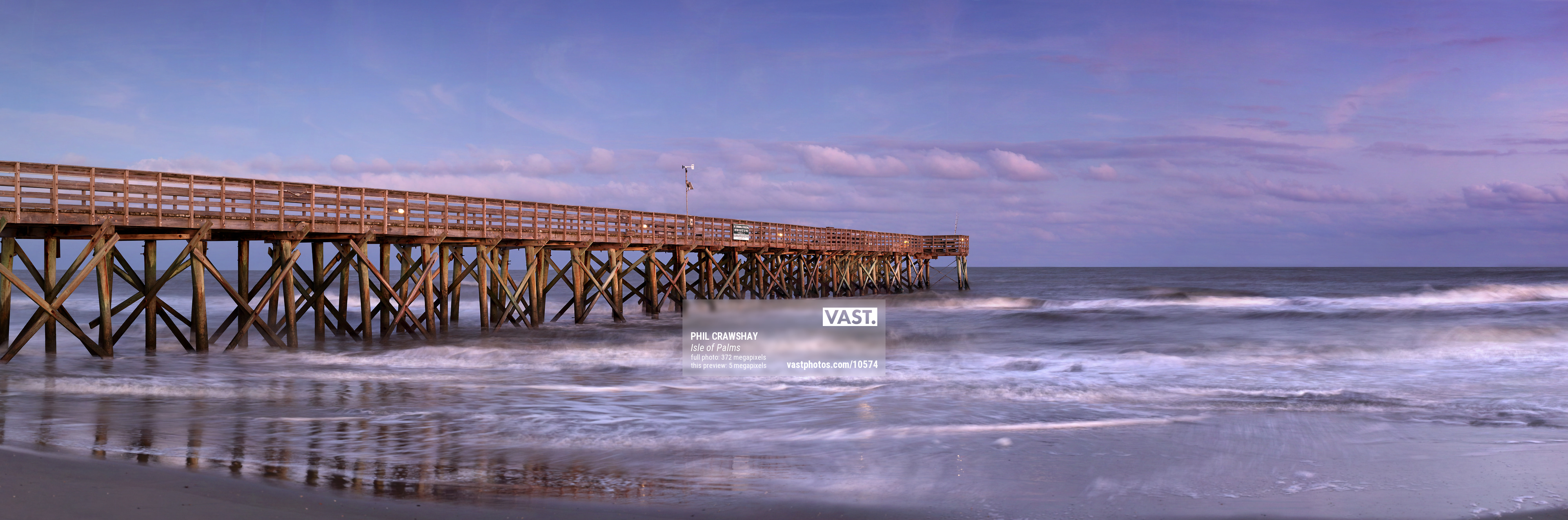 372 megapixels! A very high resolution, large-format VAST photo print of a beach with a pier going out into the ocean at sunset; photograph created by Phil Crawshay in Isle of Palms, South Carolina.