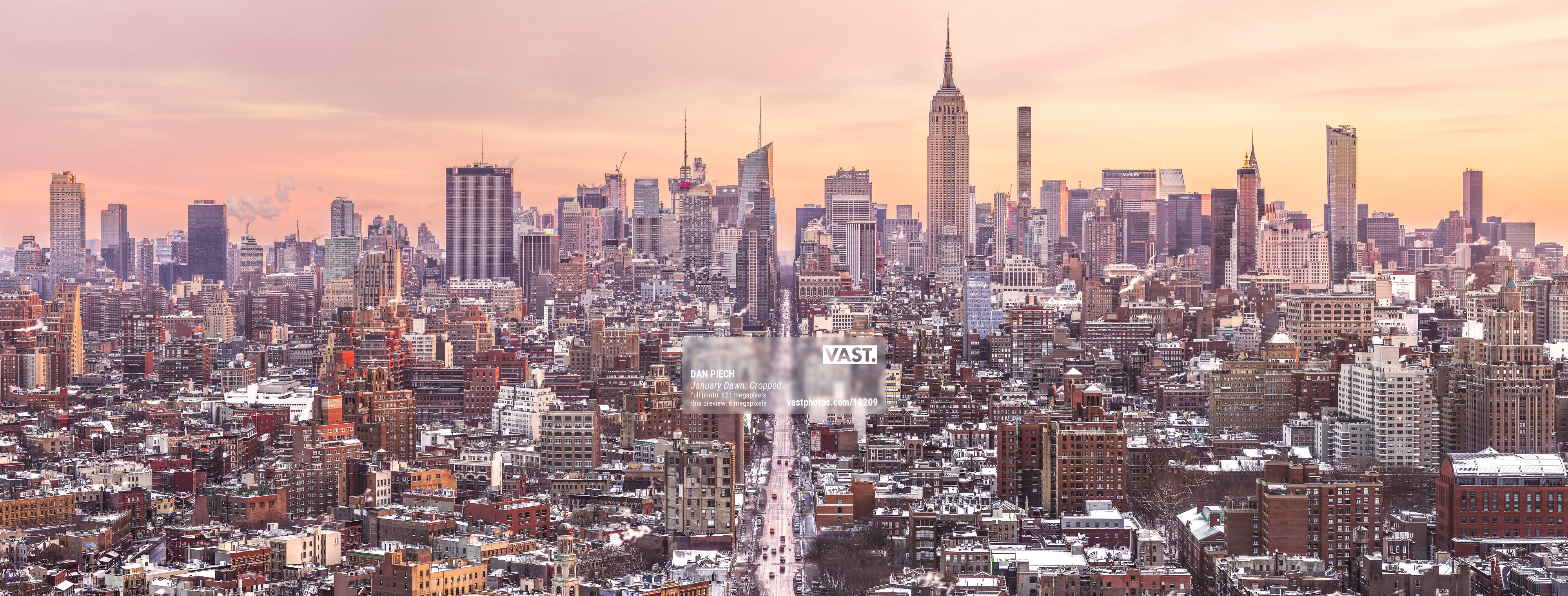 621 megapixels! A very high resolution, large-format VAST photo print of the NYC skyline in winter snow; cityscape sunrise fine art photo created by Dan Piech in New York City.