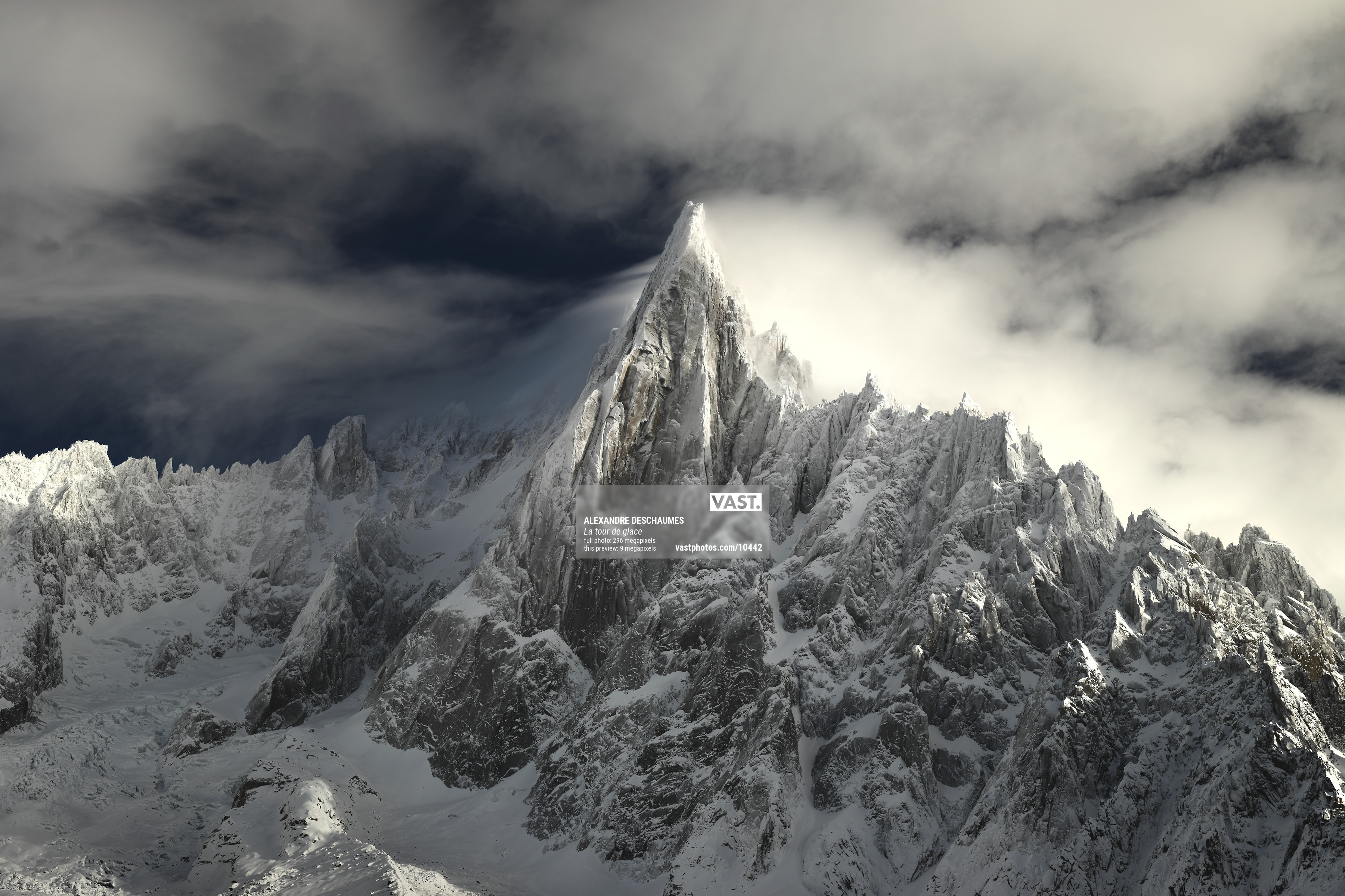 The powerful peak of "les drus" captured above the sea of ice in Chamonix Mont Blanc. The mountain is all frosted after a storm.