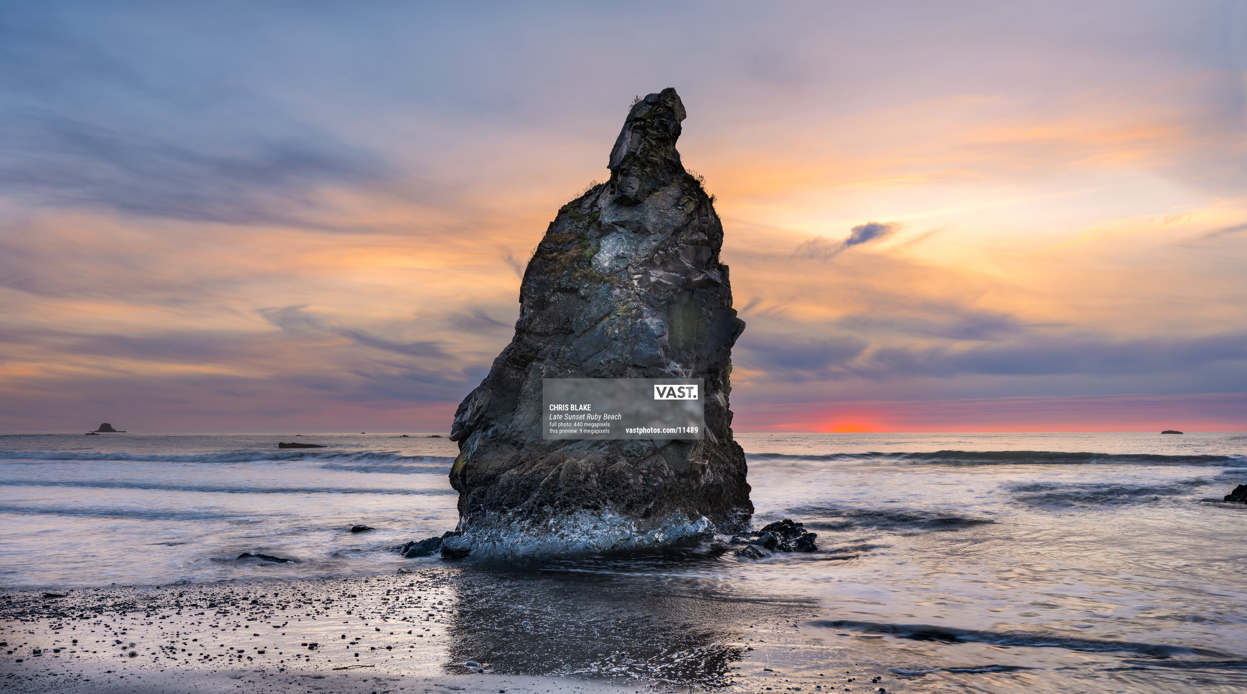 Within this VAST photograph, a breathtaking sunset sky takes center stage, ablaze with hues of crimson and yellow. The vivid red tones, intensified by the waning light, bestow an ethereal quality upon the scene, evoking a profound sense of tranquility and magnificence. The massive stone sea stack proudly holds its place in the heart of the composition, enveloped by vibrant colors and the rhythm of the waves.