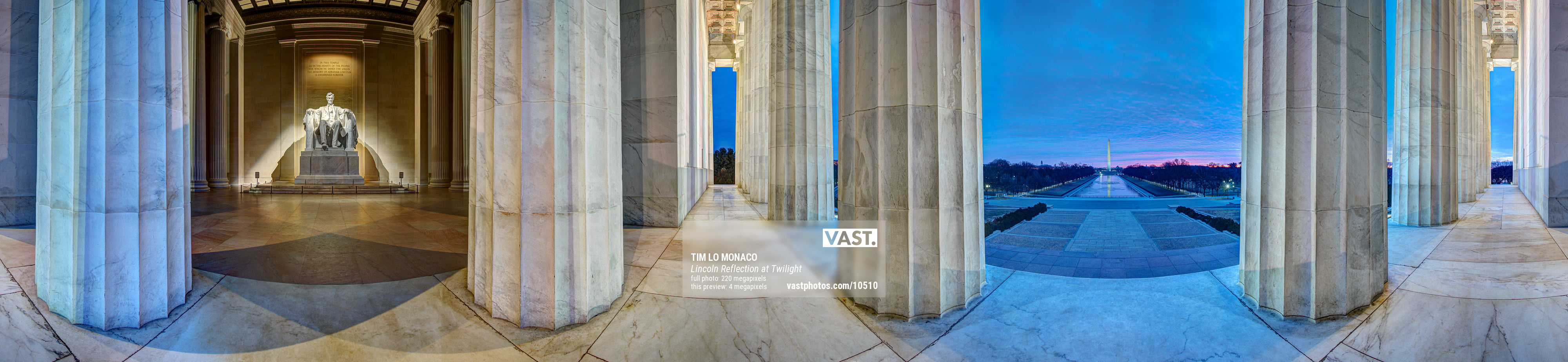 The full circle of this single row panorama makes for the initial feel that it was shot with a wide-angle lens but leaves the viewer, many of whom have visited the Lincoln Memorial, wondering where or how exactly this image was taken. The moment of realization that the marble statue of Lincoln and the Reflecting Pool with the Washington Monument are actually opposite each other fascinates me to this day. I enjoy how this method makes for a surreal feel while still being a fairly straightforward image.