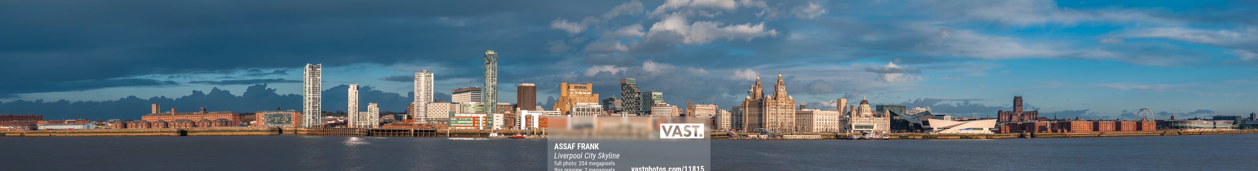 This panoramic photograph beautifully captures the iconic skyline of Liverpool, UK, as seen across the River Mersey. The cityscape is a stunning mix of historic and modern architecture, with landmarks like the Royal Liver Building standing proudly alongside contemporary skyscrapers. The play of sunlight and shadows on the buildings adds depth and character to the scene, highlighting the unique architectural diversity of Liverpool.