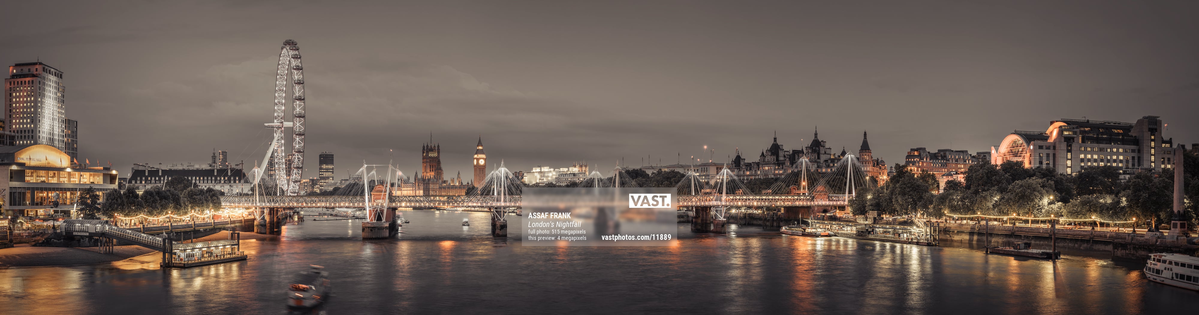 On the right, the South Bank comes alive with its cultural landmarks and vibrant nightlife, showcased through the glowing lights and subtle reflections. The overcast evening sky adds a dramatic backdrop, enhancing the sepia tones and providing depth to the panorama. This photograph beautifully encapsulates the essence of London, illustrating its rich history, architectural splendour, and the continuous pulse of urban life.
