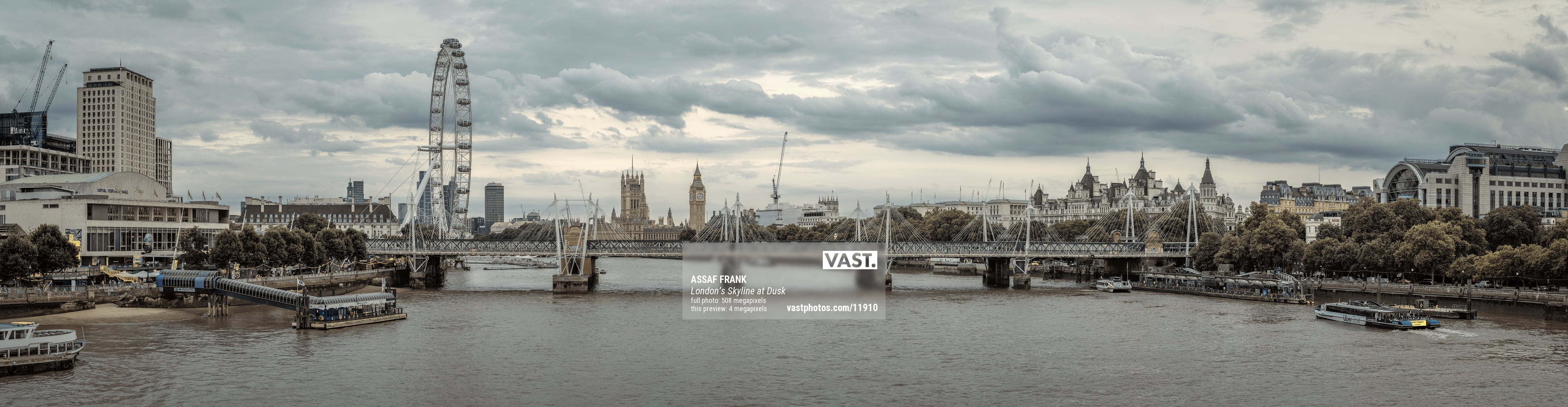 This panoramic image of the London city skyline with the River Thames perfectly captures the grandeur and iconic landmarks that define the heart of the city. The famous London Eye stands tall on the left side of the frame, towering over the Southbank and offering stunning views of the city. Stretching across the River Thames is the pedestrian Golden Jubilee Bridge, framing the scene while leading the viewer's gaze towards the unmistakable structure of the Houses of Parliament and Big Ben. The grey, dramatic clouds overhead add a sense of atmosphere, contrasting with the calm, flowing river below.