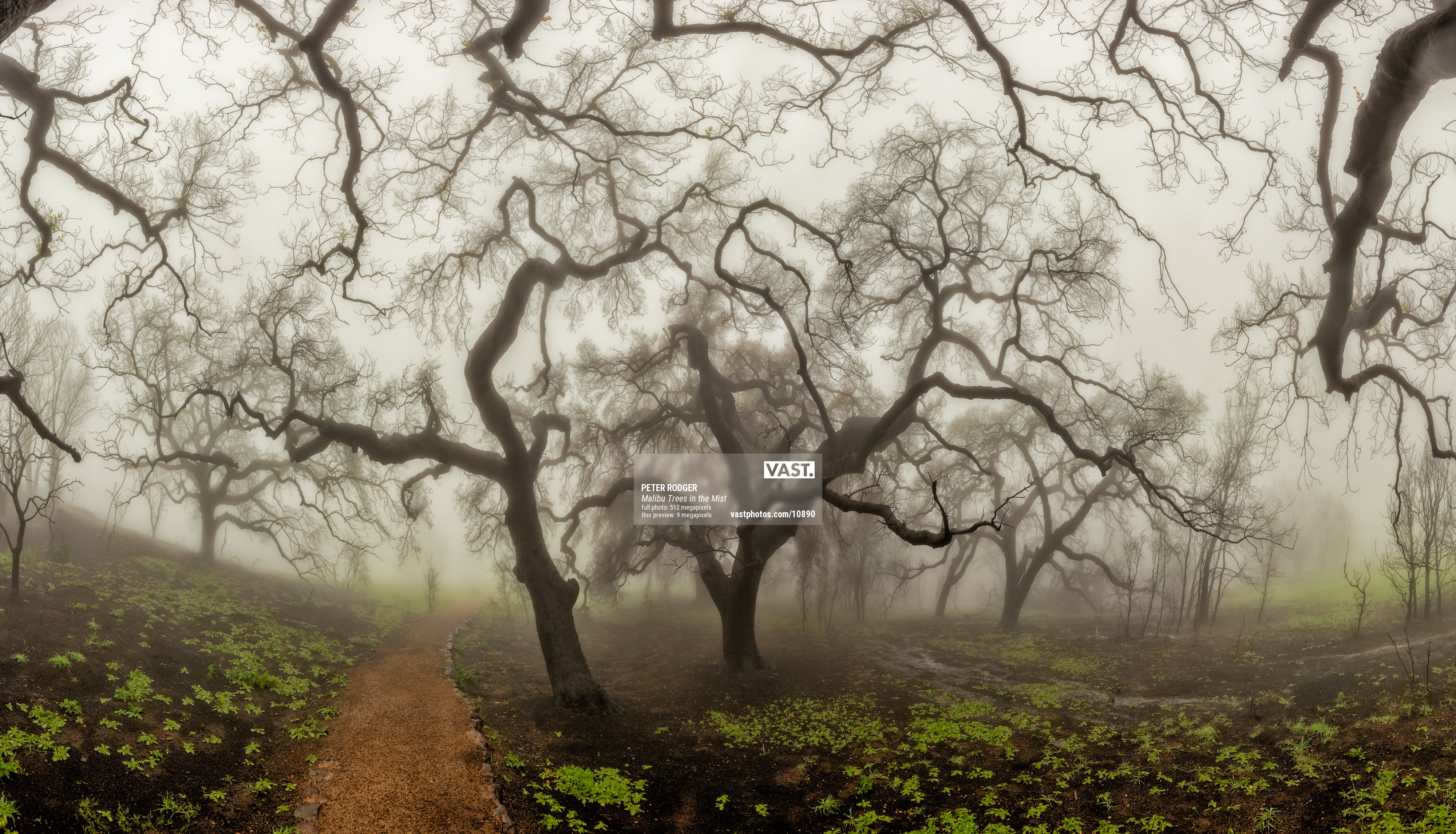 Only after the horrible events of the Malibu fires was I to witness the rebirth of the wild areas above the ocean in Malibu. Nature is strong. Nature prevails and this image is a homage to the beauty and life that lives within. Amongst the charred black trunks of burnt-out trees, little sprigs of green were starting to appear. The fog rolled in and made ominous, yet beautiful, shapes and cut distance - creating a world where only nature understands.