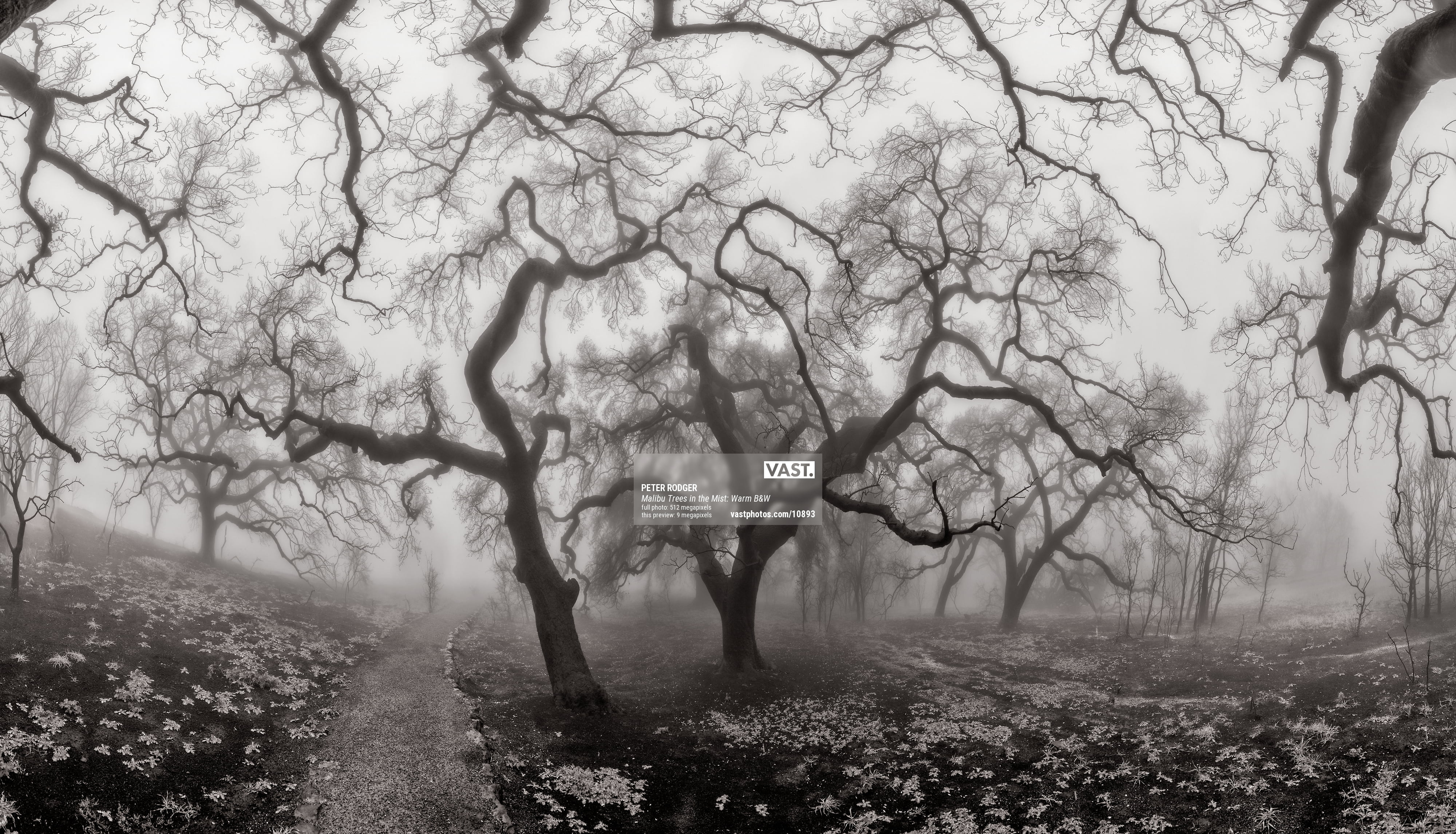 A close-up of "Malibu Trees in the Mist: Warm B&W" by Peter Rodger: an ultra-high-resolution VAST photo.