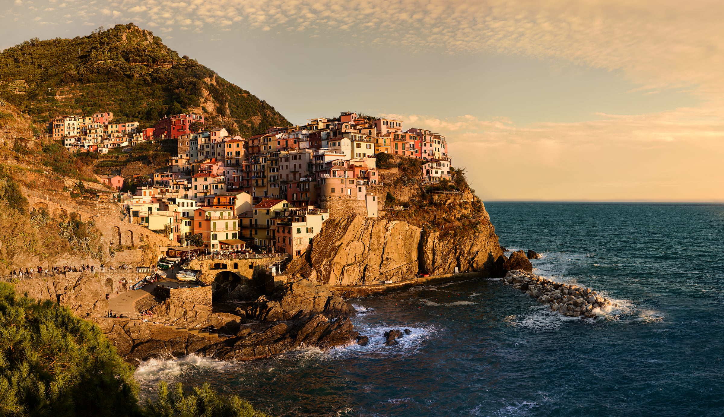 Creating an ultra-high-resolution VAST photo of Manarola has been on my wish list for a long time. You could even say it was a bucket list item. Of the five towns that make up Cinque Terre, it has always been Manarola that I long to photograph. Yes, the others are nice, but the coastline extending out into the sea to the north of town is what makes Manarola so special. From that point is a wonderful view back toward the village; a spectacular display of multicolored houses stacked on one another up the cliffs. Whether standing along the pathway taking in the view or enjoying an Aperol spritz in a coveted seat at the wonderful Nessun Dorma restaurant, this is the place to be. And the Holy Grail experience is to be there during a sunlit golden hour light show.Â