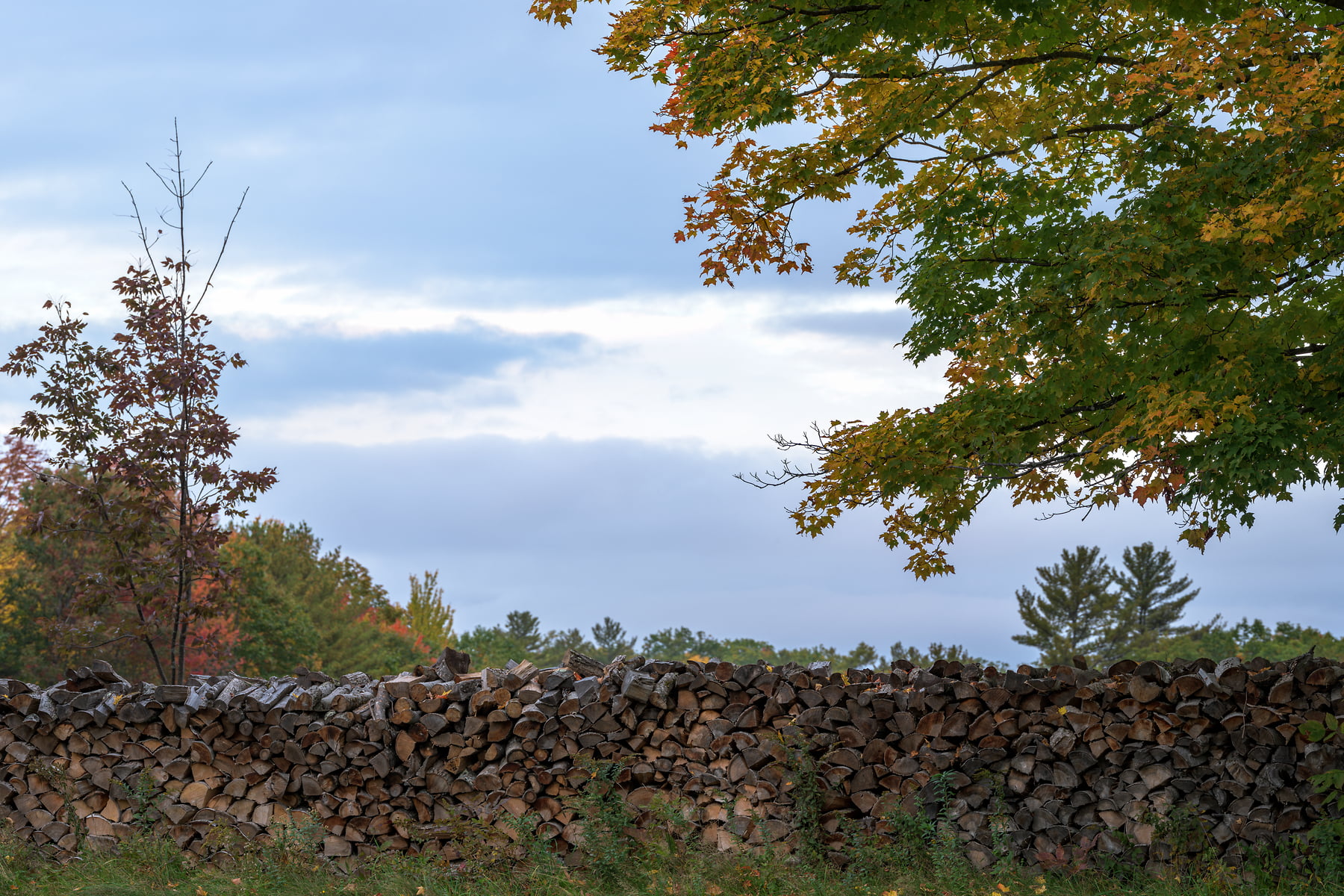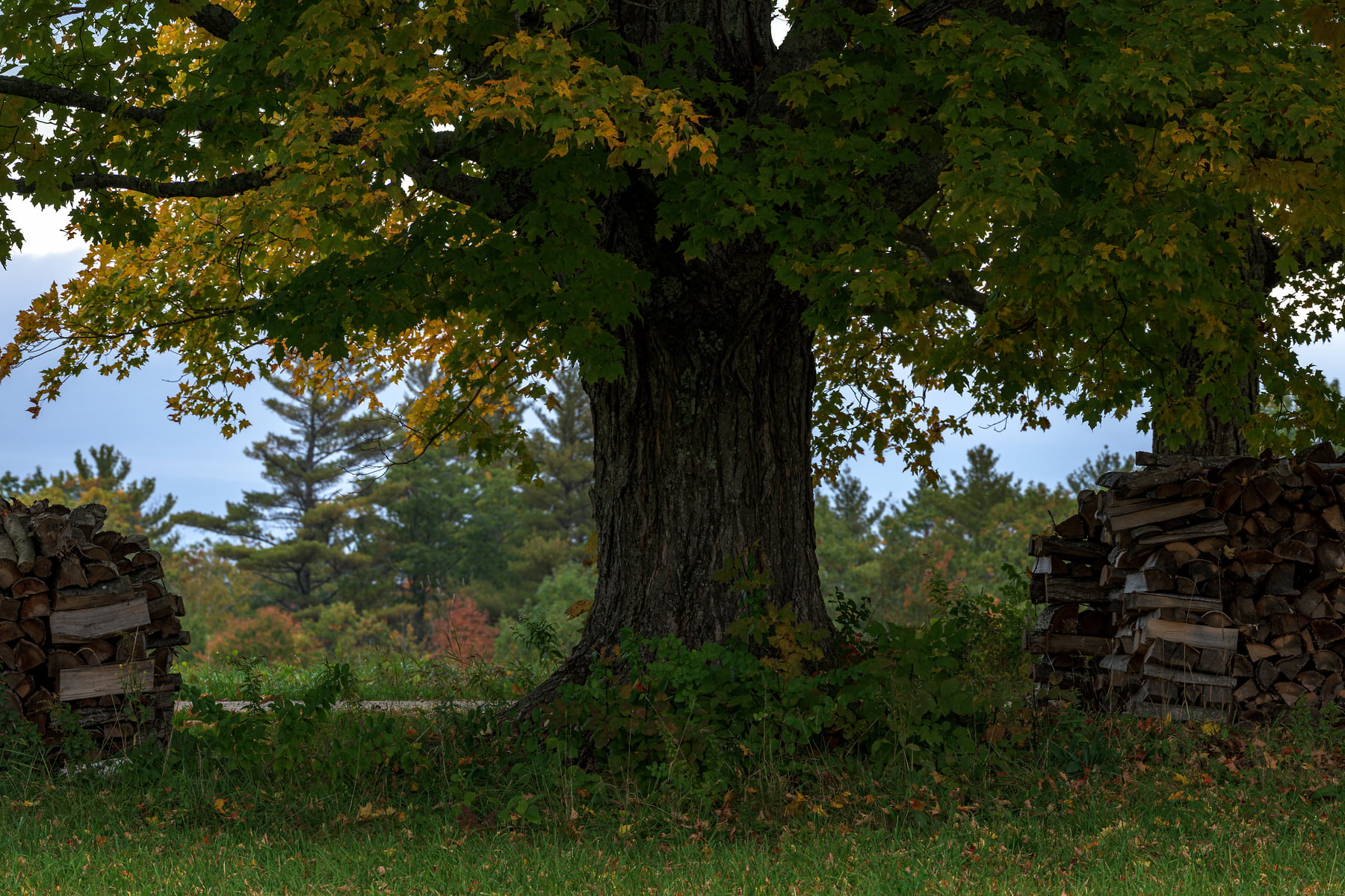 This large maple tree stands tall between rows at woodpiles on Muster Field Farm in Sutton, New Hampshire, October 10, 2021, 17:55 – 18:02.