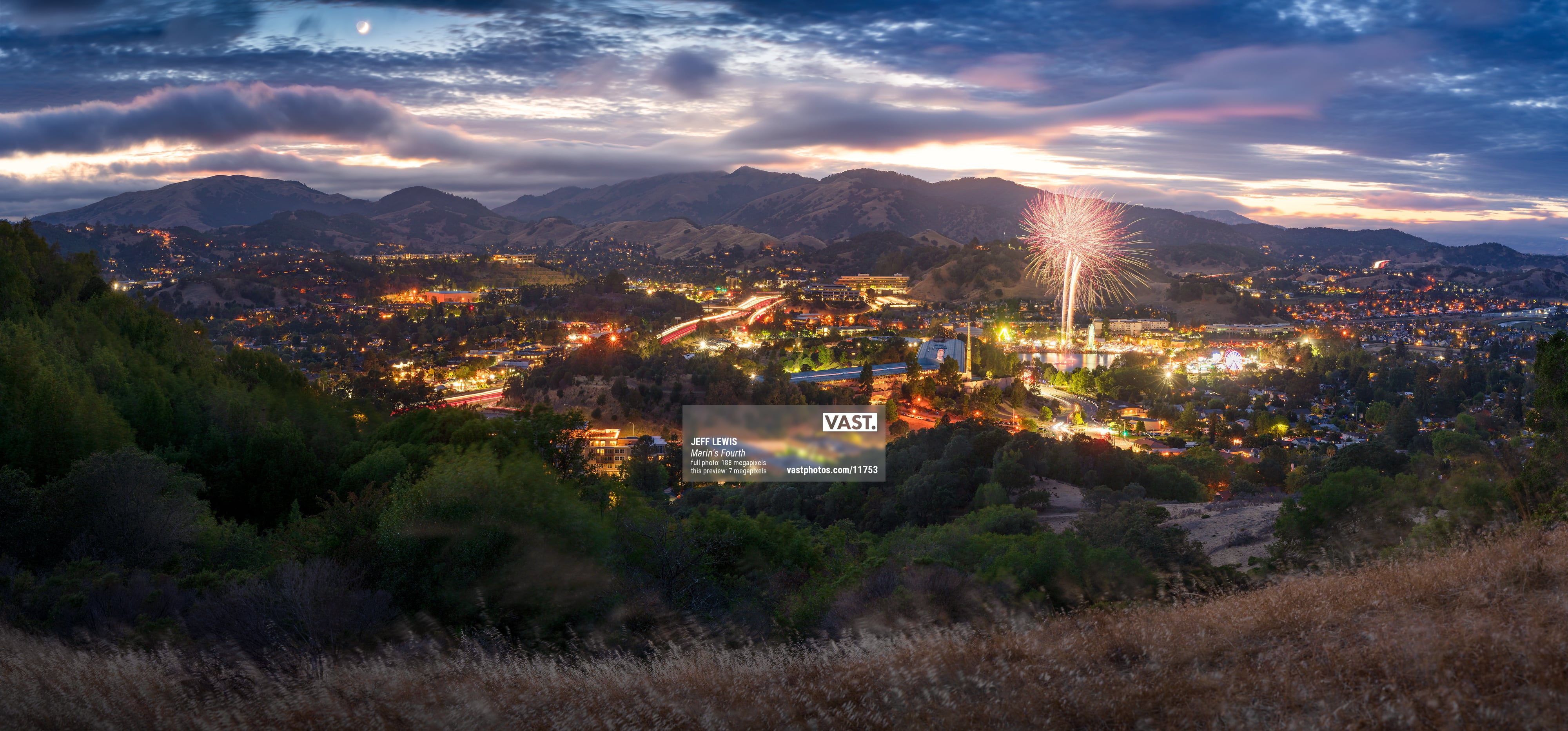 The beloved Marin County Fair sets off fireworks every year around the Fourth of July. I hiked up a nearby mountain to discover this unique perspective on the fireworks show, capturing it with so many of the things that make Marin special -- the hills, the twinkling lights, and the sunsets.