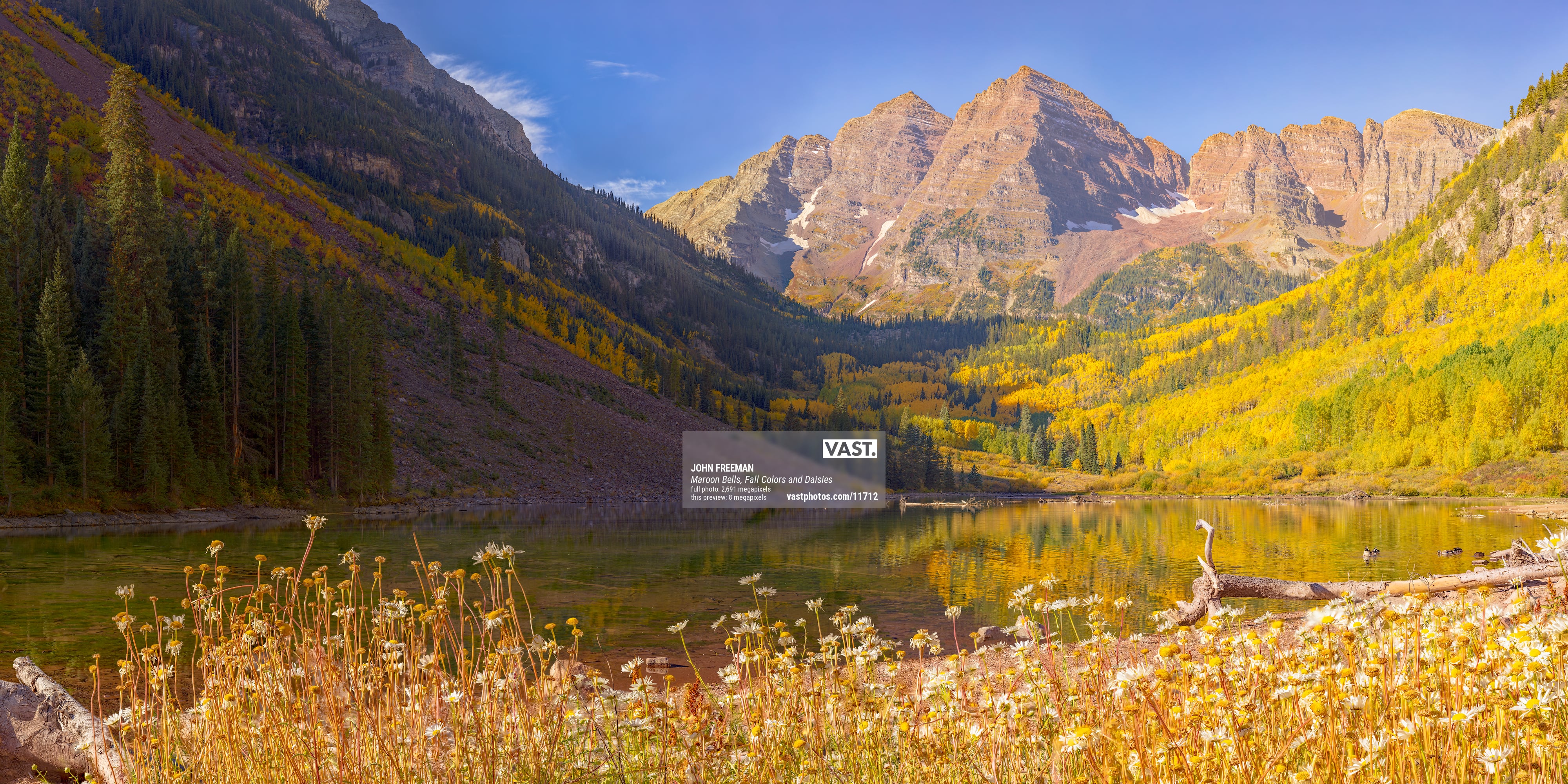 On this particular morning, as I was walking along the north shore of Maroon Lake I couldn't help but notice this patch of white daisies still blooming even though it was late September. I watched as several people took cell phone shots of the daisies with the Bells in background, a beautiful shot for sure. As I viewed the scene I realized that there was hardly a breath of wind so the flowers were nearly motionless, an essential requirement for doing a focus bracketed set of images. With such a beautiful scene I contemplated if I could pull off shooting a gigapixel wall mural of this beauty God had provided us on this glorious morning. Always up for a challenge to capture God's creation in a gigapixel wall mural, I decided I would position my tripod about 3ft. above the ground, some 6ft. from the daisies (which is as close as my 300mm lens will focus) and attempt to included them in a shot with them as the prominent foreground subject. Plus as a bonus, the lake was nearly a mirrored surface reflecting the yellow Aspens on the foot hills of the Bells. A couple pairs of ducks quietly fed along the shoreline as I was shooting.