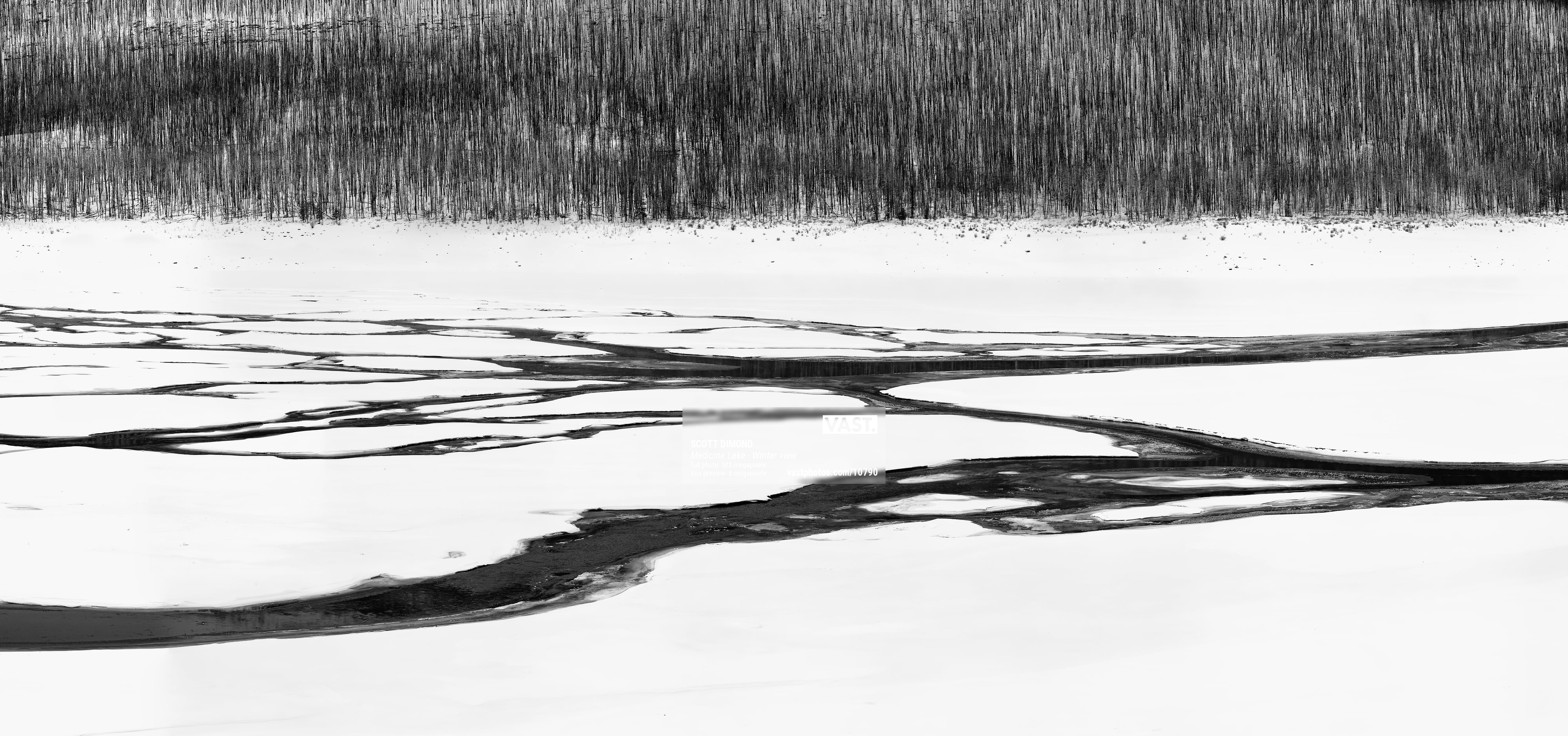 During the summer months when there is lots of meltwater trying to squeeze underground, the water backs up and creates what looks like a large lake. During the winter, Medicine Lake turns into a meandering collection of channels across the frozen expanse. Combined with the remnants of a July 2015 forest fire, the resultant winter view across the “lake” takes on a sense of surrealism with its combination of white snow, dark water, and blackened trees.