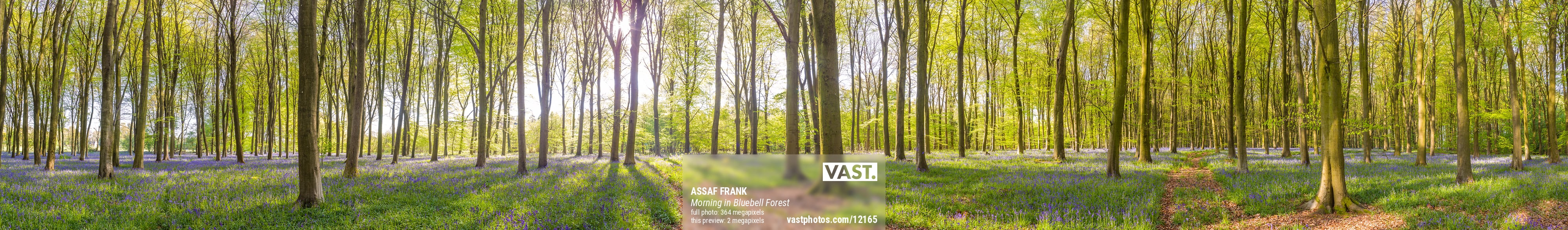 The panoramic format of the photo provides an immersive, wide-angle view that emphasizes the expansive beauty of the forest. It draws the viewer's eye across the tranquil scene, where nature’s symmetry and patterns unfold in harmonious detail. The contrast between the purple bluebells and the tender green of new leaves creates a visually striking and soothing palette, evoking the freshness and rebirth of spring.