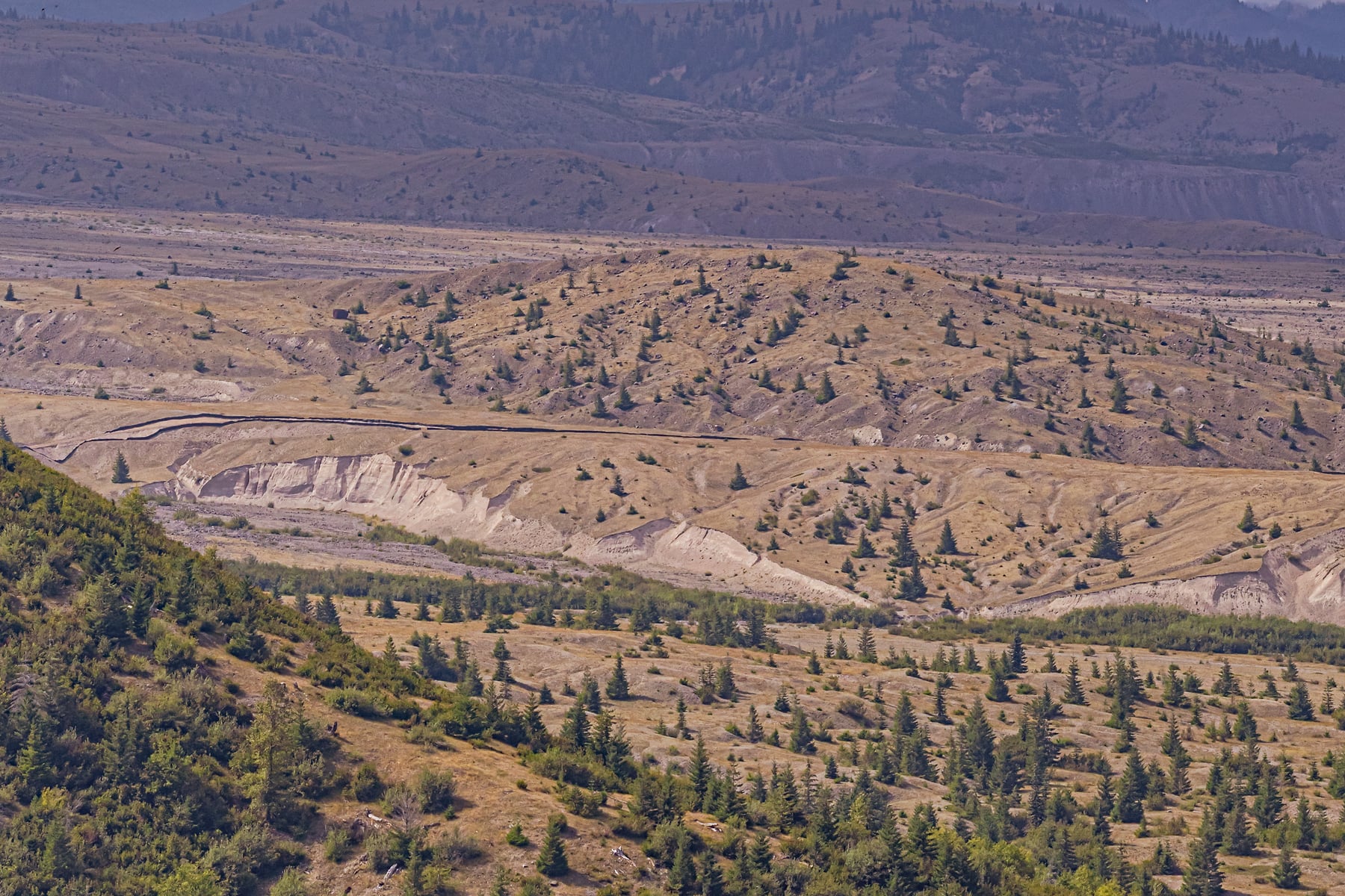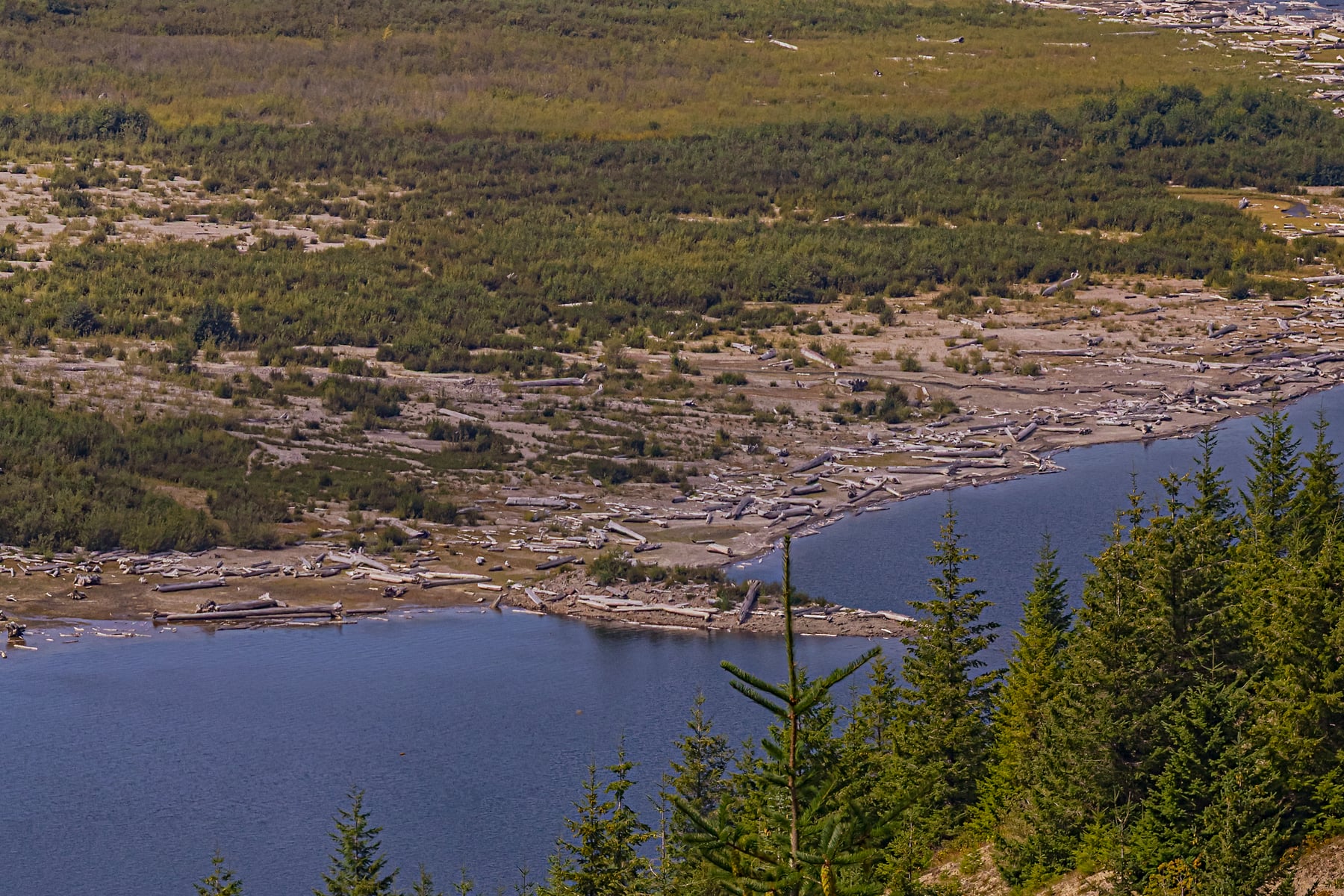 It's been 45 years since the volcano's 1980 eruption. Yet 45 years later the lake in the photo has numerous logs from the trees that were snapped like toothpicks when the mountain exploded.