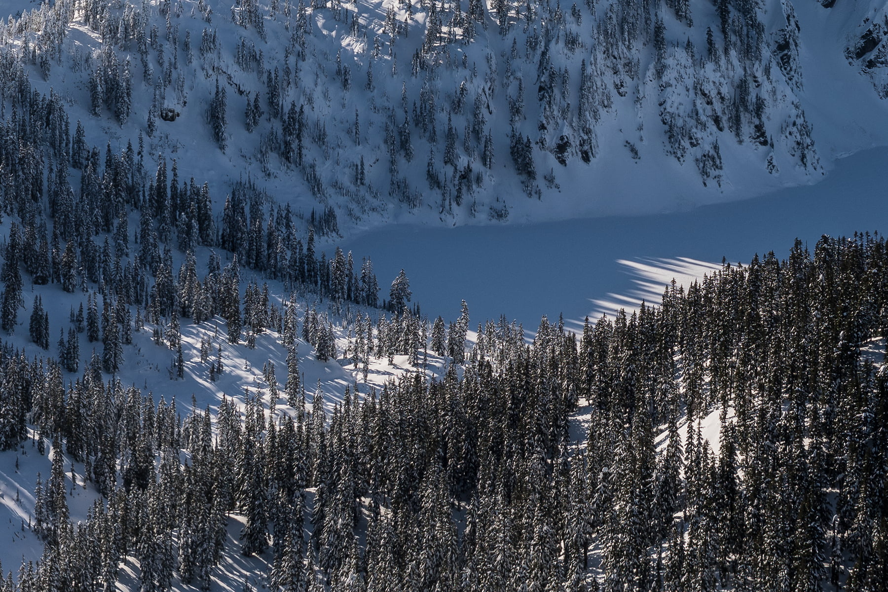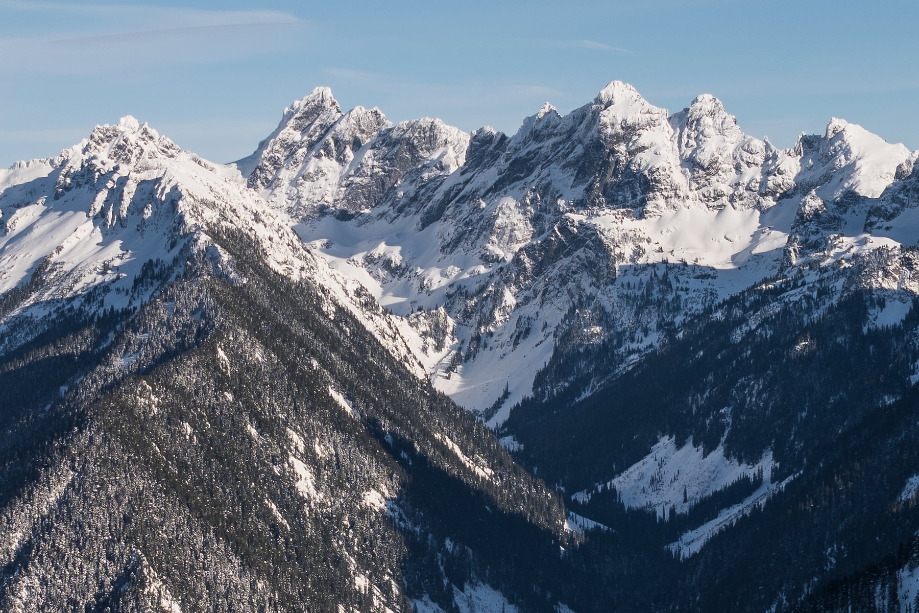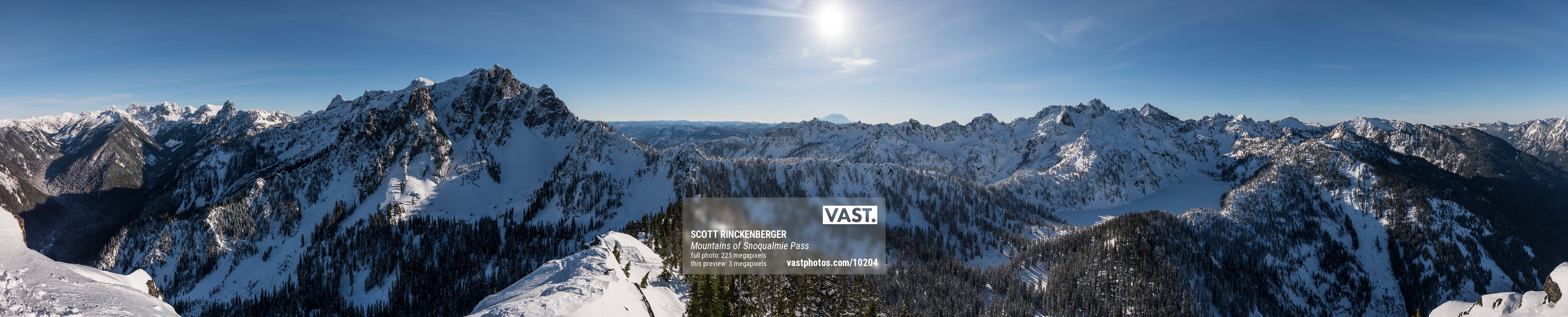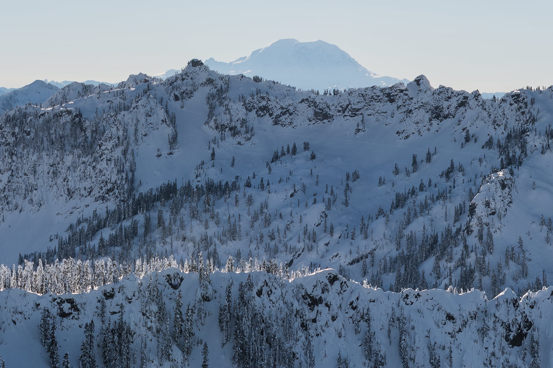 Vast, complex and technical, these mountains take years to understand, but with the help of extremely detailed photographs like this one, it is possible to envision dream outings of every stripe. This photograph was created in the first week of 2017 as a cold high pressure weather system opened up access to the tallest summits. Despite being captured during the middle of the day, at these latitudes the sun always hangs low in the southern horizon, in this case directly above the iconic cone shape of Mount Rainier.