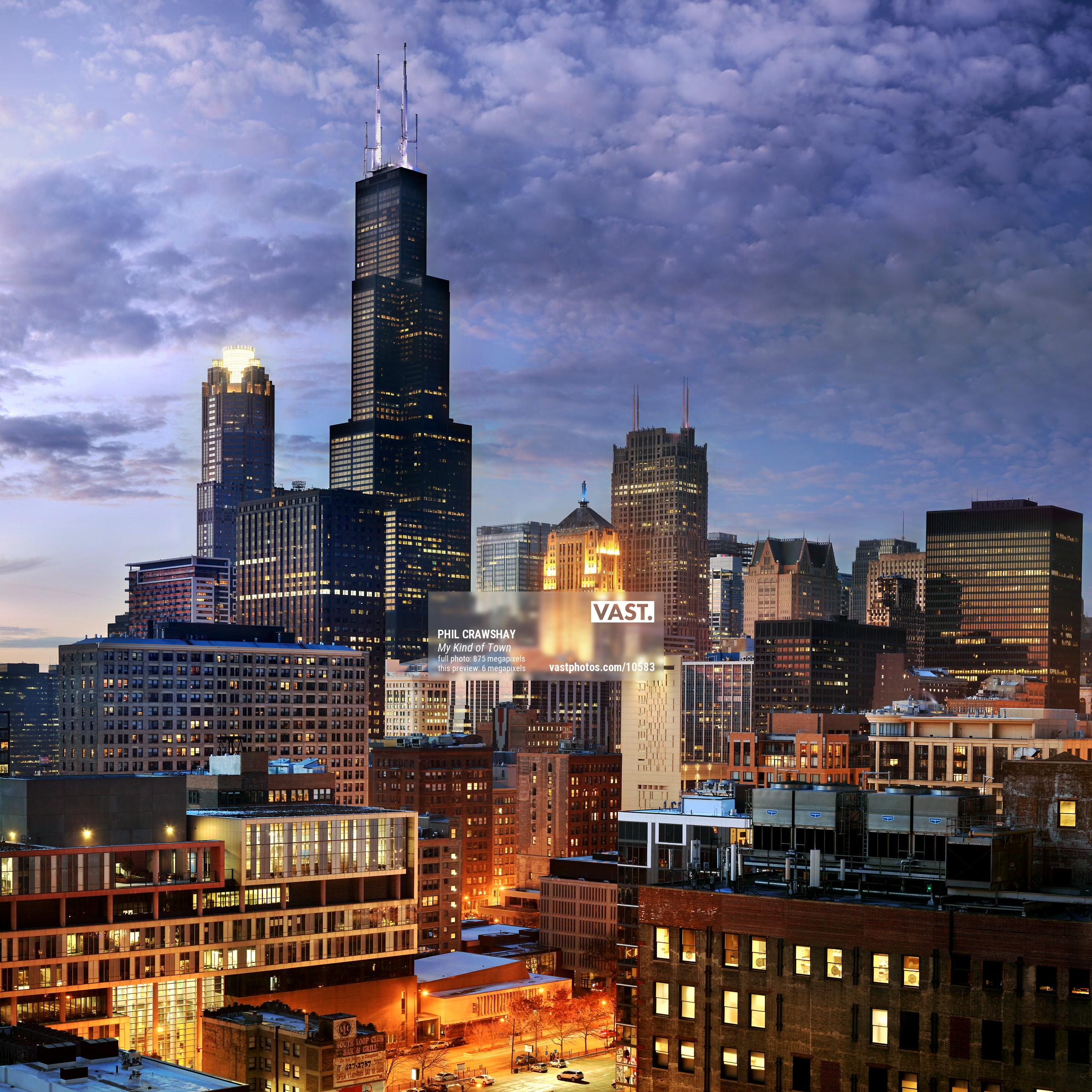 875 megapixels! A very high resolution, large-format VAST photo print of the Chicago skyline at sunset; cityscape photograph created by Phil Crawshay in Chicago, Illinois.