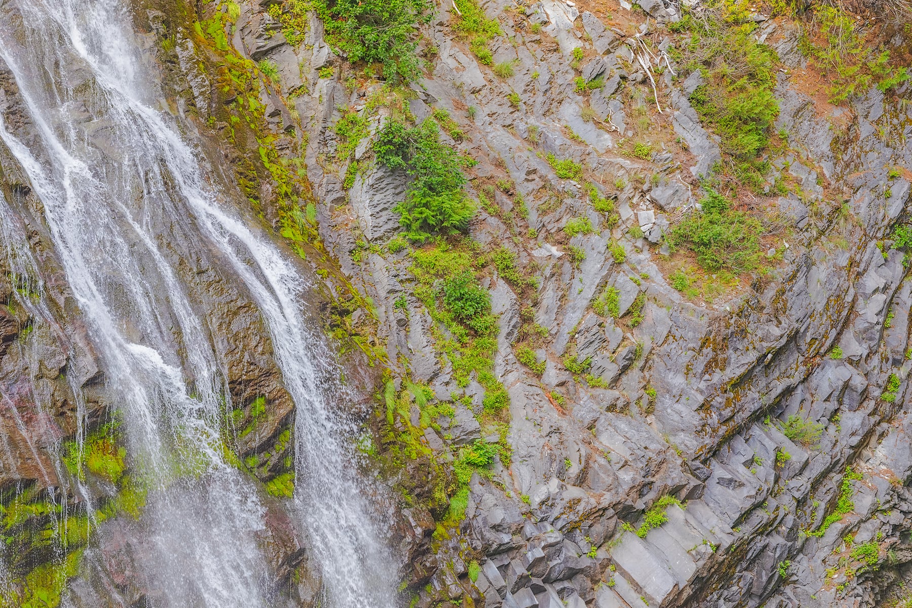 At the end of the short but steep trail, the entire 168-foot-high waterfall is visible. The vista is not only about dramatically falling water but also the rock that creates the steep drop. Here the Paradise River plunges over the edge of a relatively recent flow of hard Andesite lava that abuts much older rock. This lava’s cooling was accelerated by contact with the icy surface of the glacier that once filled this valley. The Paradise River runs clear, not milky, because it originates from snowfields, not debris-laden glaciers.
