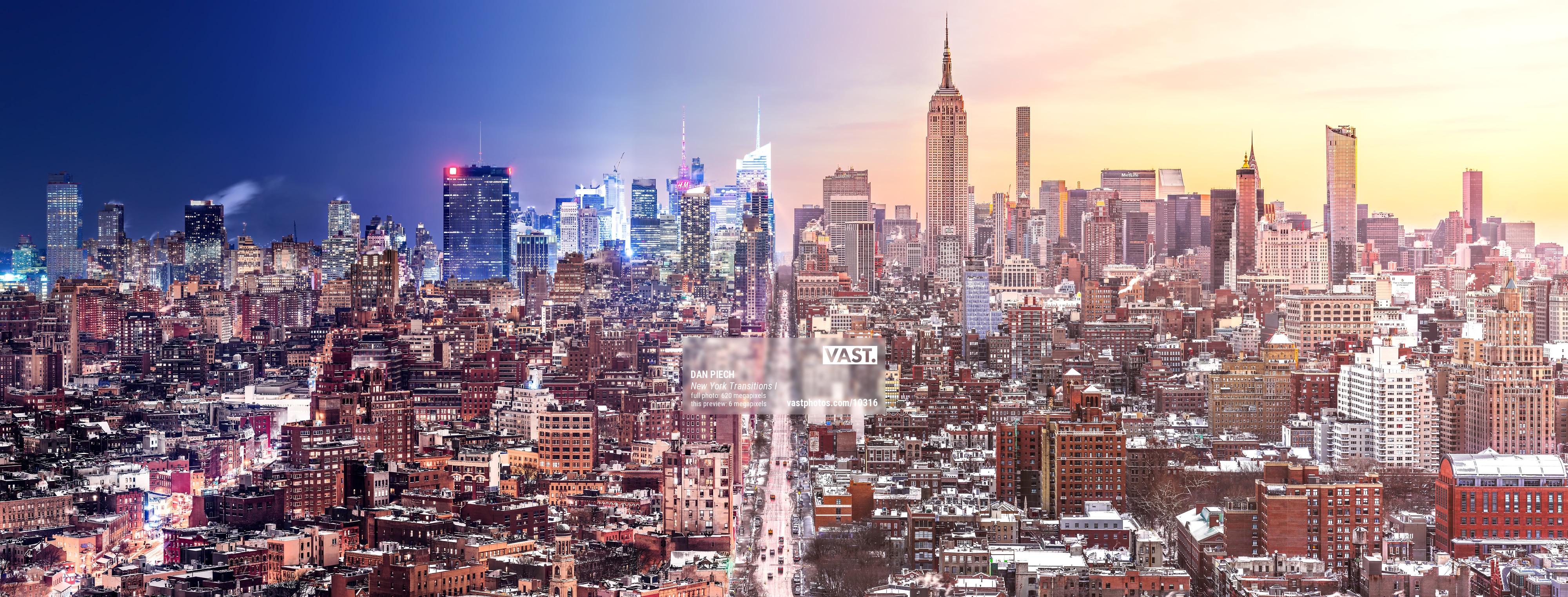 Created from 105 individual exposures taken over many hours, "New York Transitions I" captures the dawn of a new day in New York City. I wanted to portray the magic of the skyline at both nighttime and daytime in a single image so I planned to create a VAST photo that transitioned from night to day as you move from left to right in the image. Furthermore, I wanted to create the photo at a special time when the city looked particularly radiant, so I waited for a snowstorm to gild the city in white...