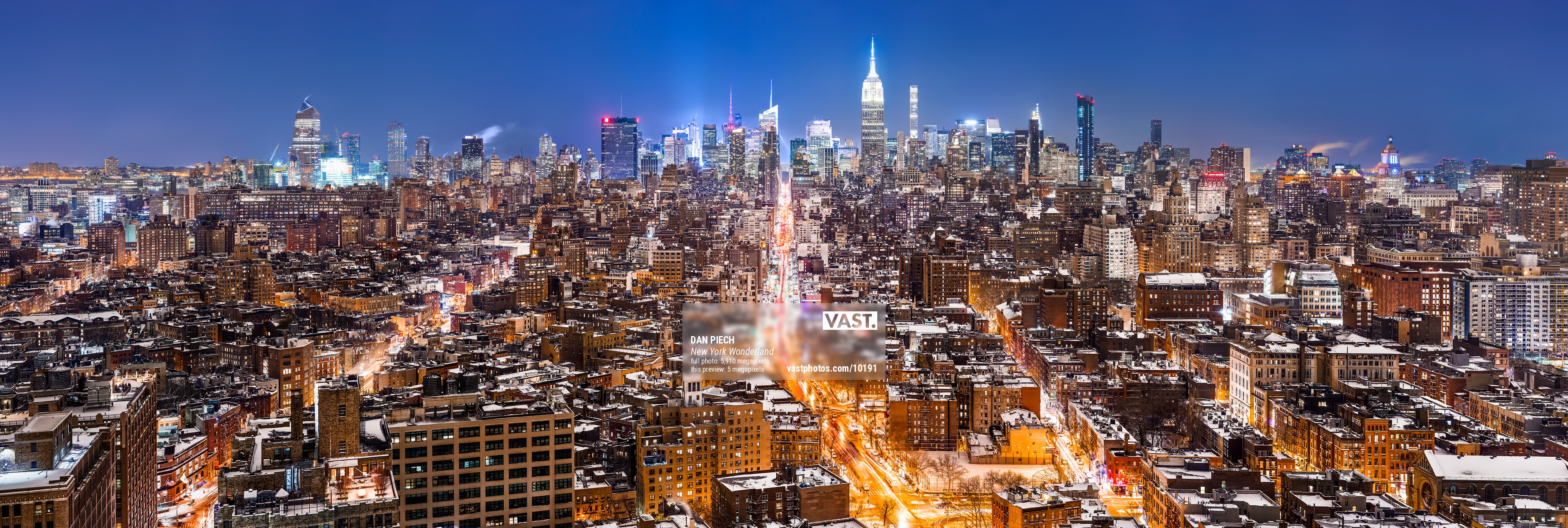 Giddy with excitement and reveling in the scene, I began exposing the 252 long-exposure images that make up this VAST photo. The fervor of cars racing up 6th avenue into the heart of the city continued uninterrupted during the two hours it took to meticulously record every last high resolution detail of this urban winter wonderland. In the weeks that followed, I spent over one hundred hours polishing and assembling the individual photos into this final VAST photo.