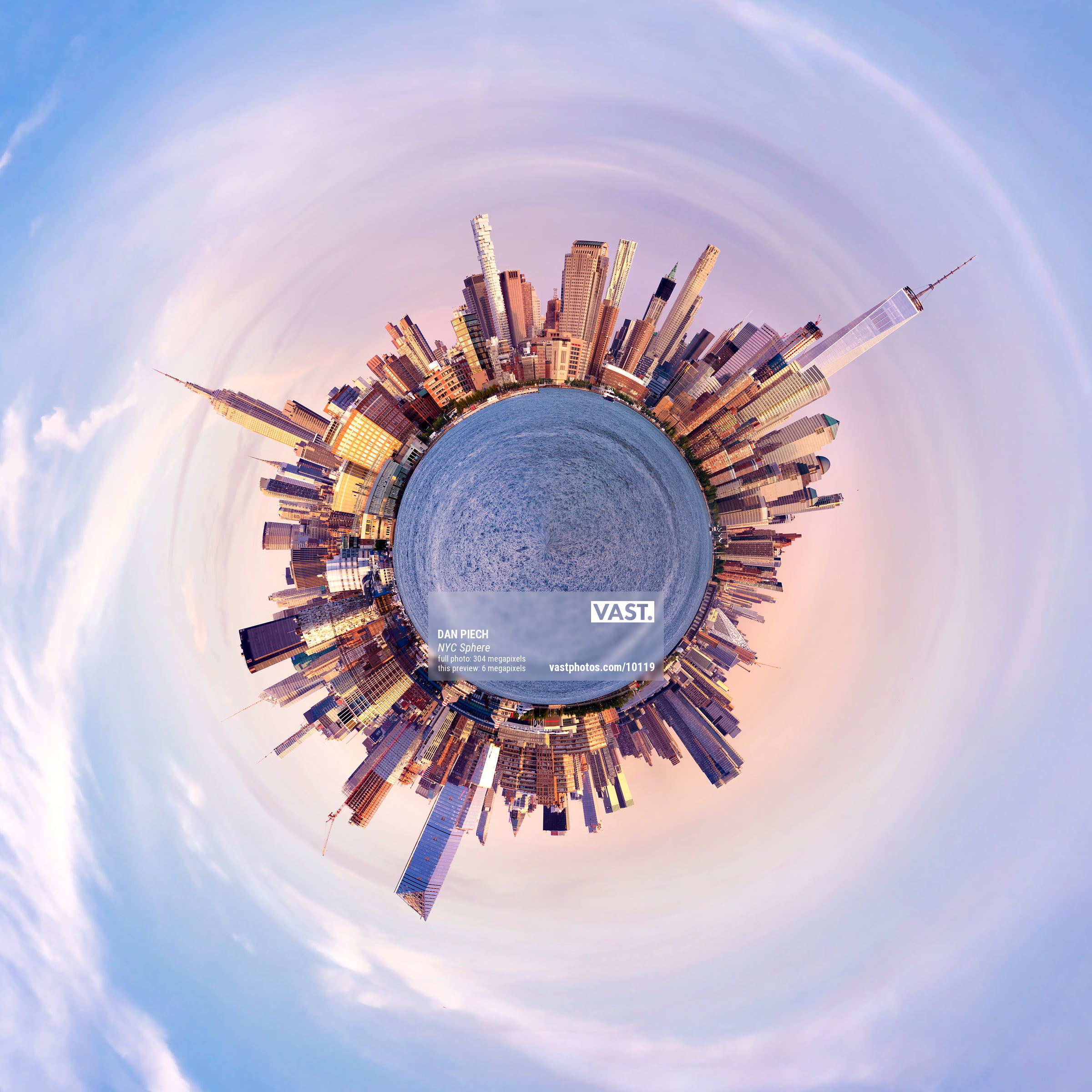 I went over to the Hudson River waterfront in Hoboken, New Jersey on a gorgeous spring evening and as the setting sun illuminated the buildings, the sky turned a beautiful palette of pastel colors, replete with wispy clouds. Taking dozens of photos, I captured the entire Manhattan skyline from 100th street down to Battery Park. The resulting image from stitching them all together is extremely wide and therefore not conducive to displaying on normal-sized walls, so I wrapped the skyline up into a circle to succinctly convey, in a more easily-consumed form, the grandeur, variety, and energy of the city.