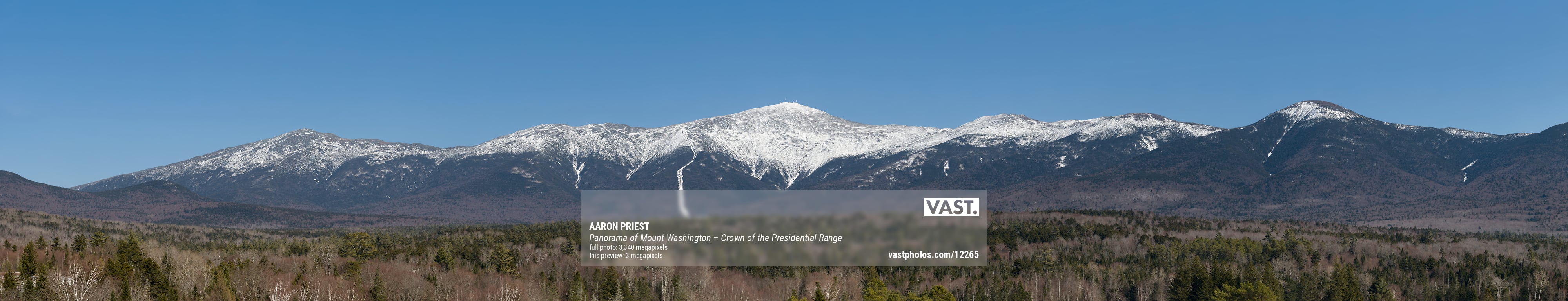 Throughout most of the winter the mountain range is shrouded in mist and clouds. If the sky is clear, it is typically due to a strong wind. This made capturing a VAST image of Mount Washington challenging and took a few months of planning and waiting for the right weather conditions to get a white, snowy foreground contrasted with a clear, blue sky combined with calm enough wind for trees to be relatively still. In mid-March I had a week that looked promising and spent a few days photographing the mountain range. About 3,000 photos were taken to create this final stitched and focus-stacked image.