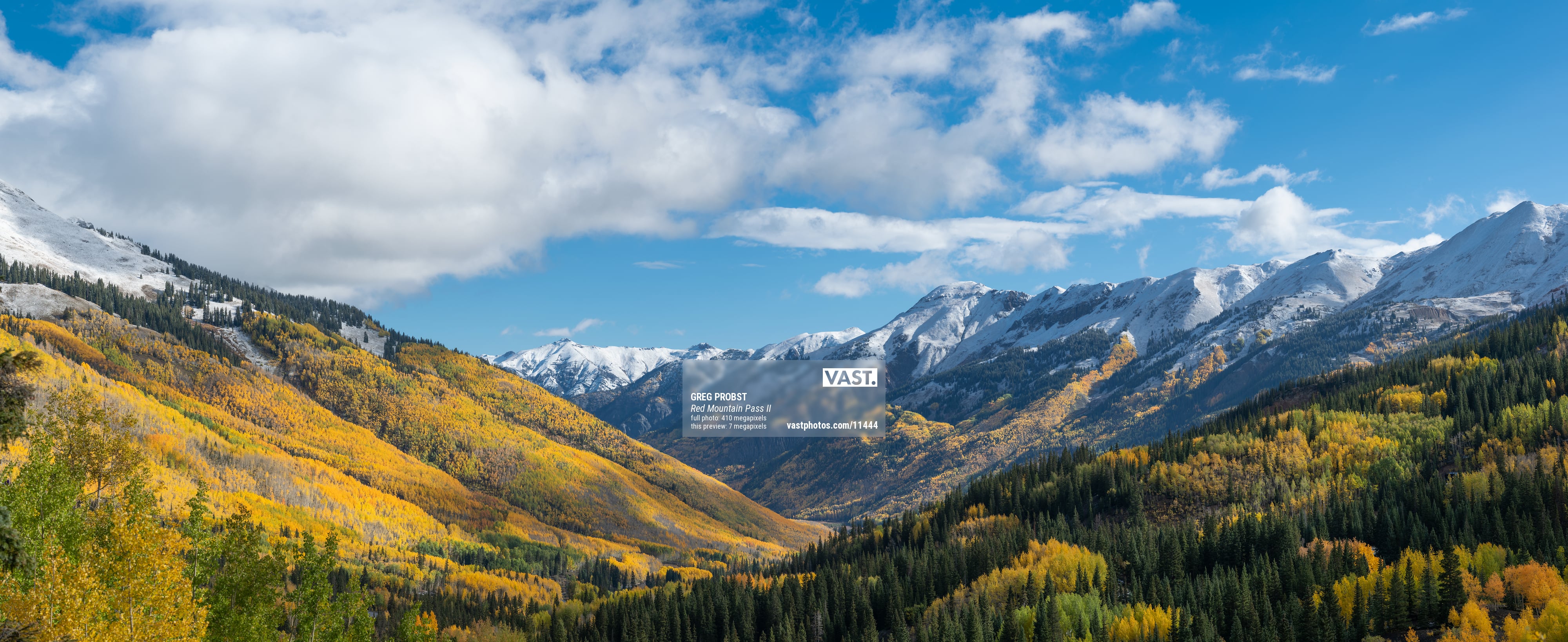 All the snow in this frame fell the night before and in the "low lands" around Ouray it rained so hard. It was a traffic jam going up hill before sunrise. The word had gotten out how good the colors were so every photographer who could get there was there, parking was at a premium. I spent 3-4 hours wathcing as the clouds came and went, trying to make a series that would work with the moving clouds and there shadows. The sun on those glowing yellow Aspen, the snow and the blue sky really make this pop.
