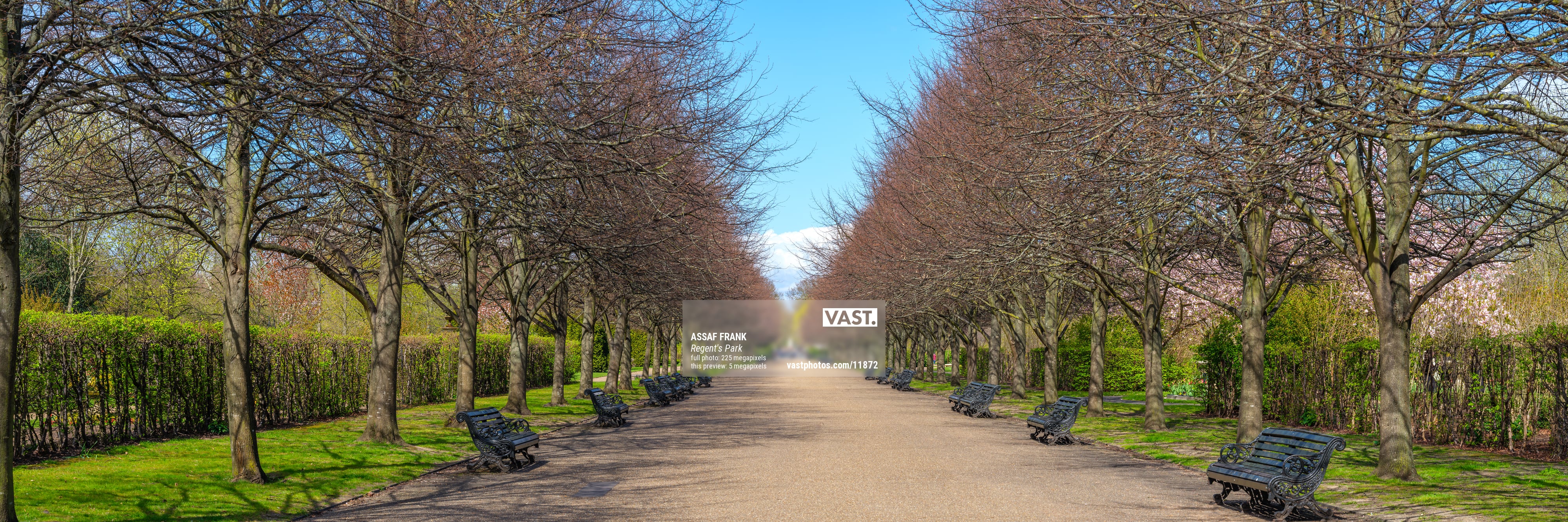 Regent's Park, one of London's Royal Parks, is depicted here in a state of quiet repose, devoid of city life's usual hustle and bustle. The leafless trees, with their intricate network of branches, create a natural canopy that will soon burst into bloom. This moment, frozen in time, allows viewers to appreciate the calm before the vibrant transformation of the park. The empty benches symbolize a peaceful retreat, offering a moment of solitude amidst the urban environment.
