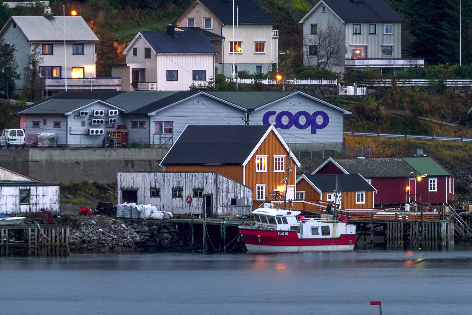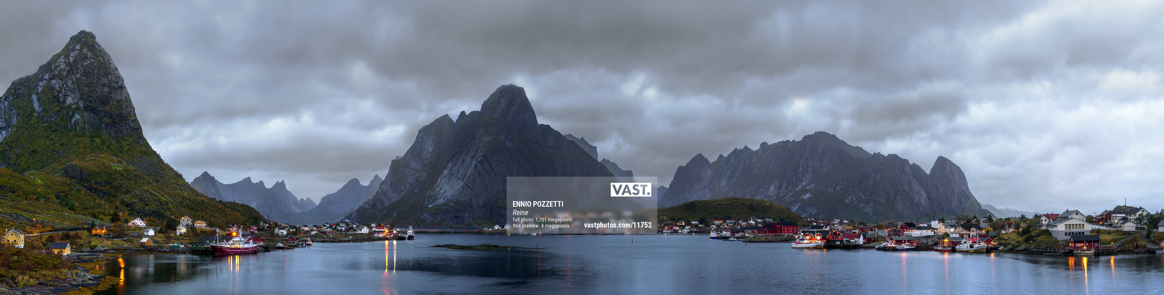 1,701 megapixels! A very high resolution, large-format VAST photo print of a moody landscape with mountains, clouds, a fishing town, and water; photograph created by Ennio Pozzetti in Reine, Lofoten, Norway.