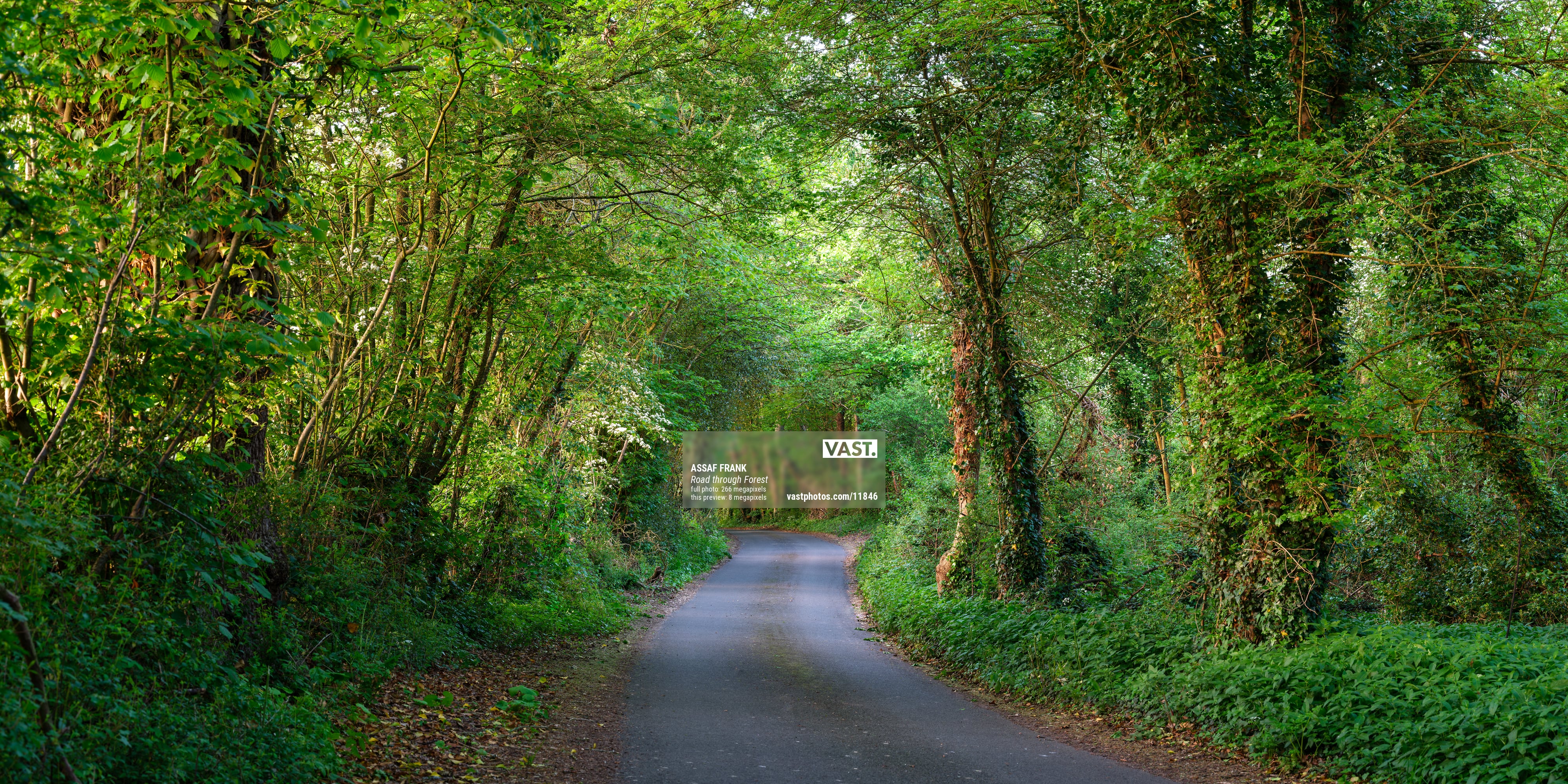 The narrow road, framed by overgrown vegetation, invites viewers to imagine a peaceful walk or drive through this enchanting woodland. The tall trees, some entwined with ivy, stand as silent guardians of this hidden gem in the English countryside. The composition leads the eye naturally along the winding path, evoking a sense of mystery and wonder about what lies beyond the bend.