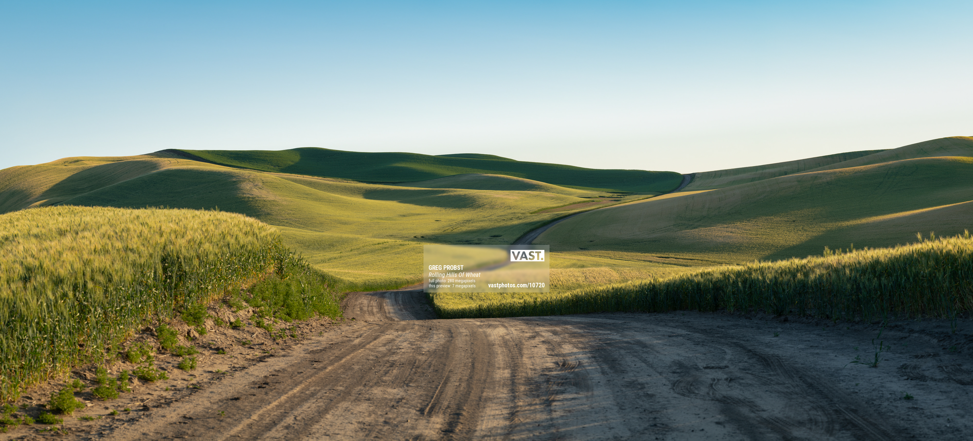 This is an iconic "Summer" road in the Palouse. It's only drivable in the Summer. During the Fall and Winter it's a soft muddy mess to drive on, AAA will not come and tow you if you get stuck. This road goes for miles, up and over ridges and finally intersects with another dirt road which does the same thing. It's narrow and if you come head to head with another car you both have to get skinny and inch into the wheat. If you come up against a combine you have to back up, may a mile or so until you can find a pull out. Photographing in the Palouse is always an adventure, you will commonly come away sweaty and dirty and with a smile on your face.