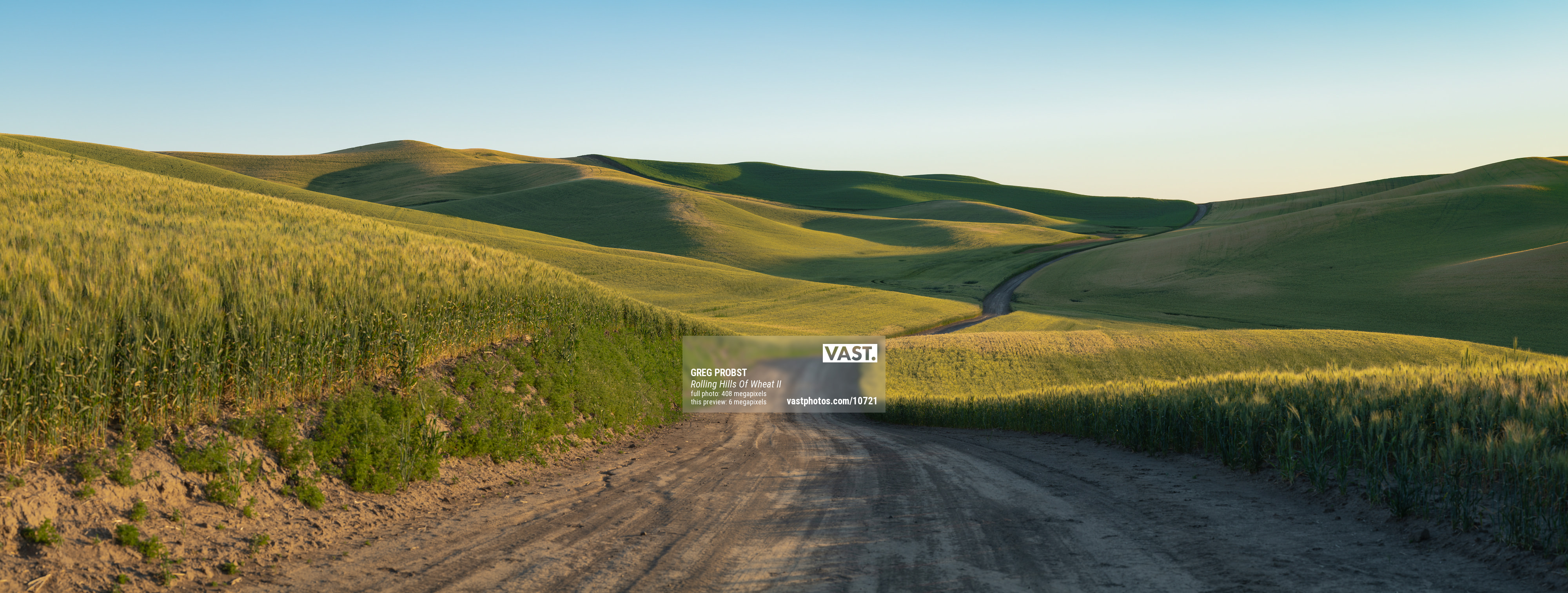 This is an iconic "Summer" road in the Palouse. It's only drivable in the Summer. During the Fall and Winter it's a soft muddy mess to drive on, AAA will not come and tow you if you get stuck. This road goes for miles, up and over ridges and finally intersects with another dirt road which does the same thing. It's narrow and if you come head to head with another car you both have to get skinny and inch into the wheat. If you come up against a combine you have to back up, maybe a mile or so until you can find a pull out. Photographing in the Palouse is always an adventure, you will commonly come away sweaty and dirty and with a smile on your face.