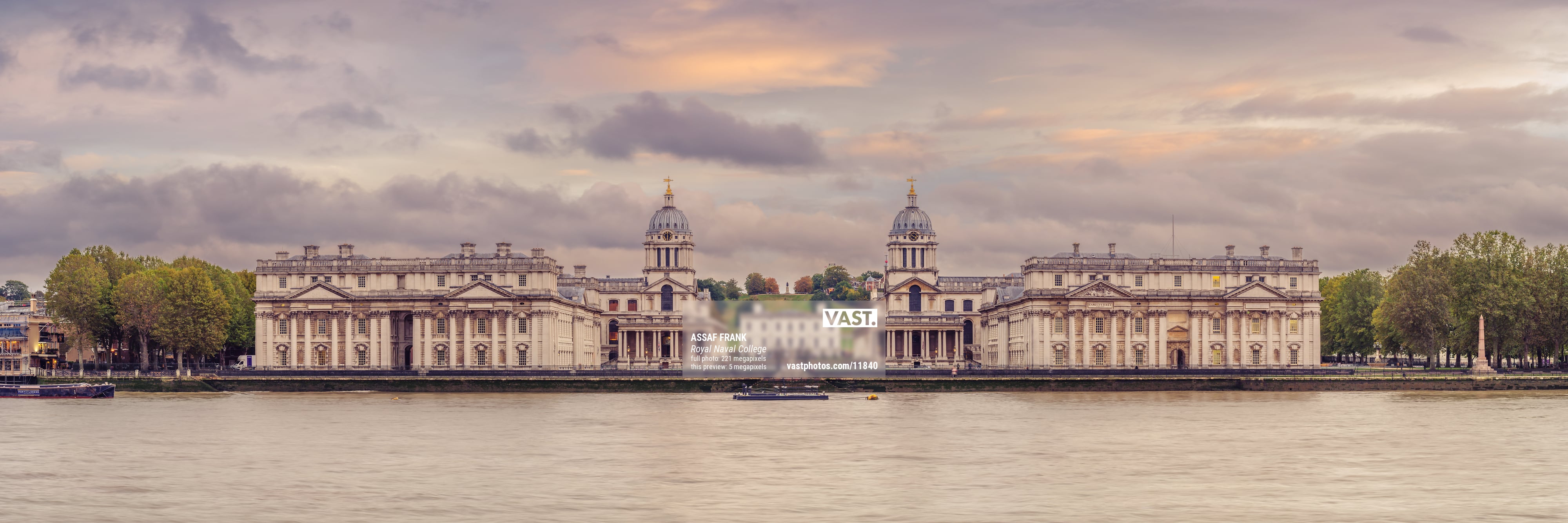 This panoramic photograph captures the majestic Royal Naval College at Greenwich, viewed from the River Thames in London. The grand neoclassical architecture of the college is beautifully framed by the calm waters of the Thames and the overcast sky, which casts a soft, diffused light over the scene. The symmetry of the buildings, with their iconic domes and stately columns, reflects a sense of historical grandeur and architectural elegance.