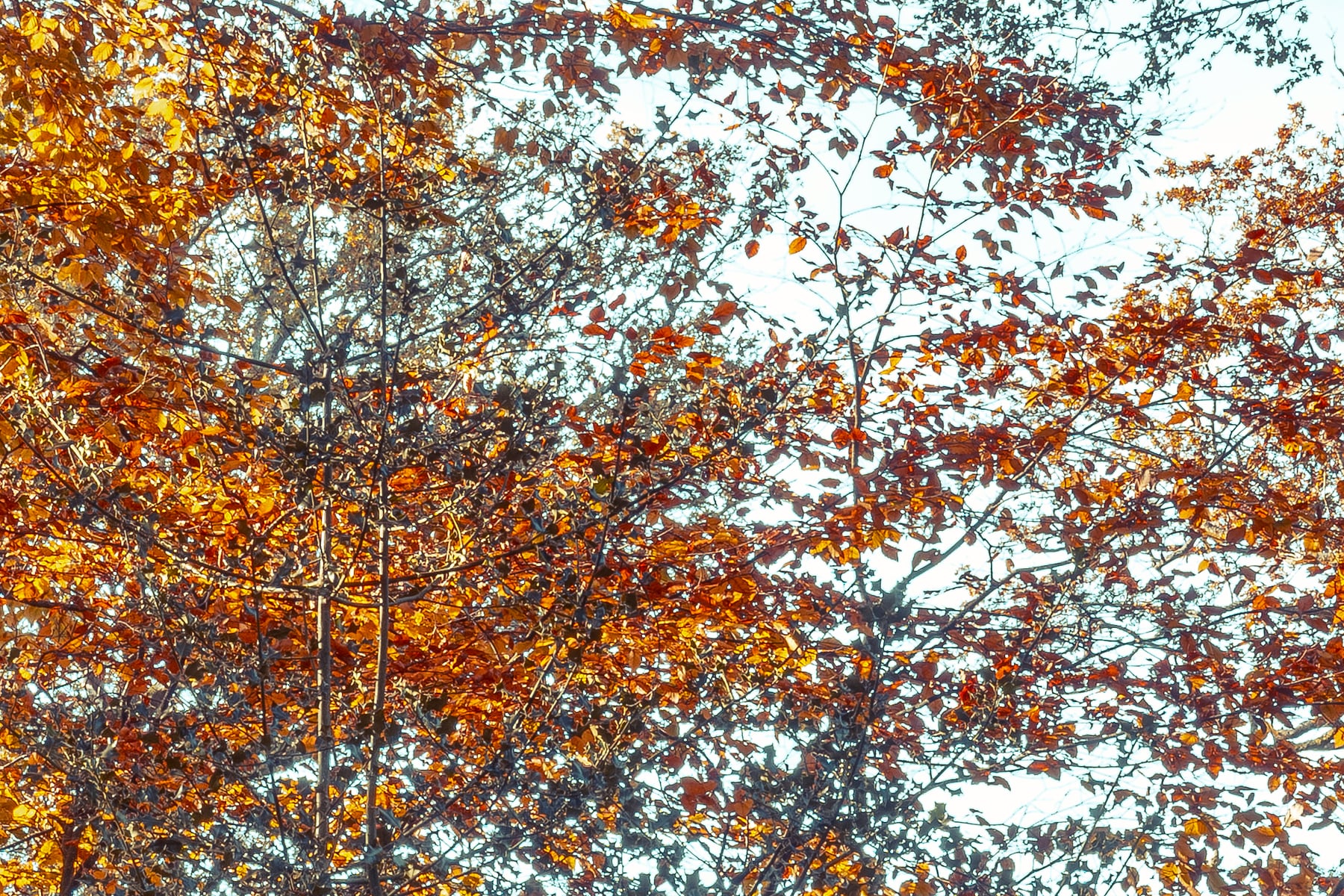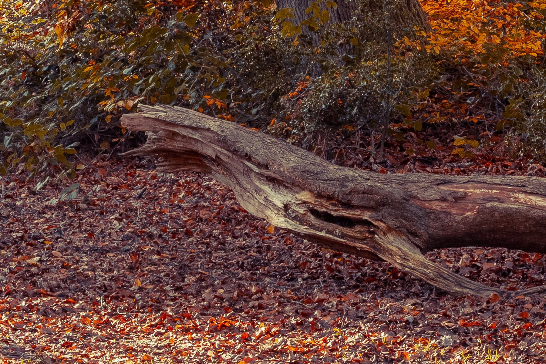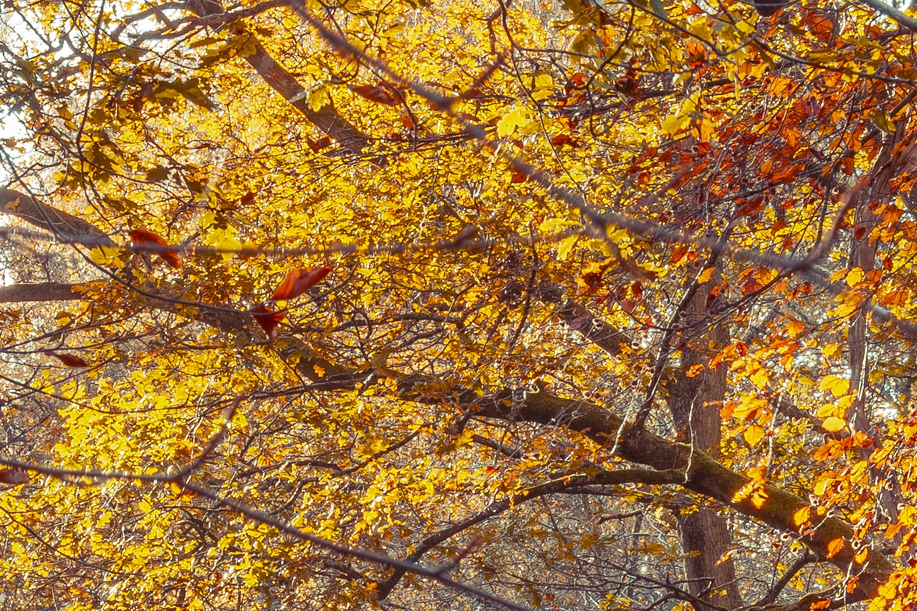 A pathway meanders through a breathtaking autumn forest, where golden leaves shimmer under the soft glow of sunlight. The towering trees, adorned with vibrant shades of orange and amber, create a mesmerizing canopy that filters the light, casting a warm and inviting atmosphere. The forest floor is blanketed in a rich tapestry of fallen leaves, while patches of green vegetation add contrast to the scene. The pathway, flanked by twisted branches and rugged undergrowth, draws the eye into the depths of the woodland, evoking a sense of exploration and tranquillity. Sunlight peeking through the branches adds a dynamic interplay of light and shadow, enhancing the textures of bark, foliage, and scattered forest debris.