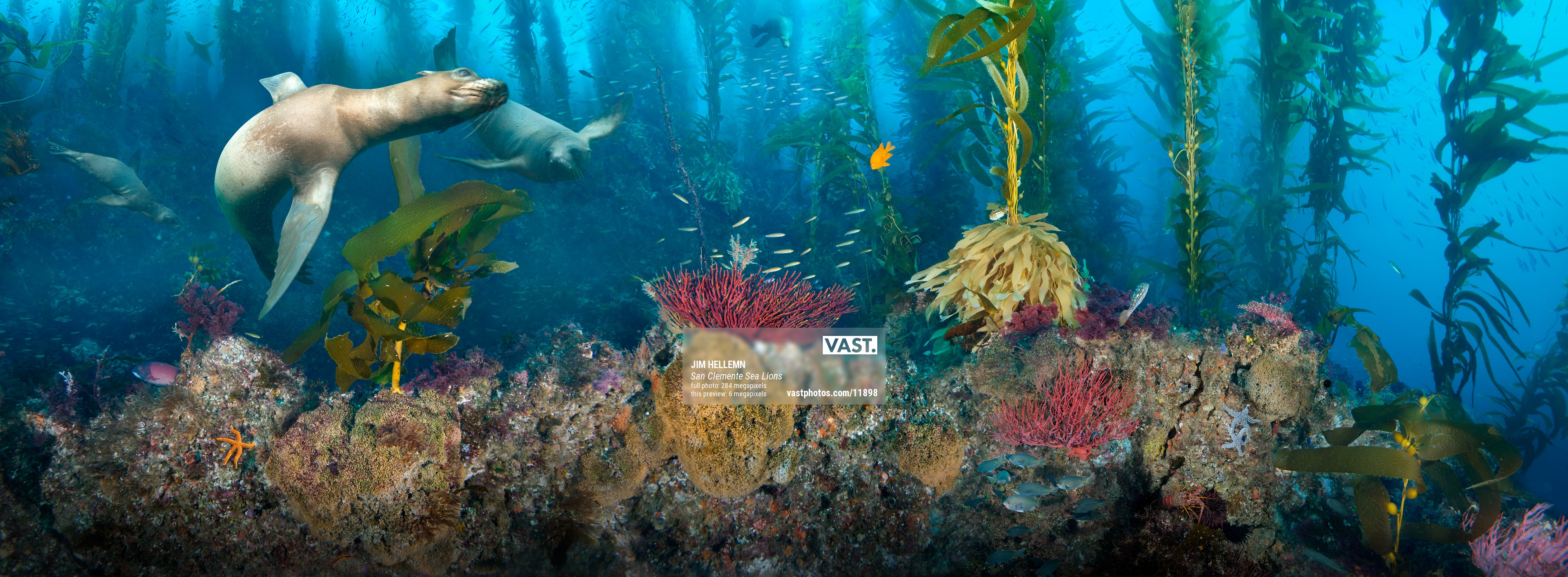 California Sea Lions in the lush Giant Kelp forests of San Clemente Island. Channel Islands, Southern California.