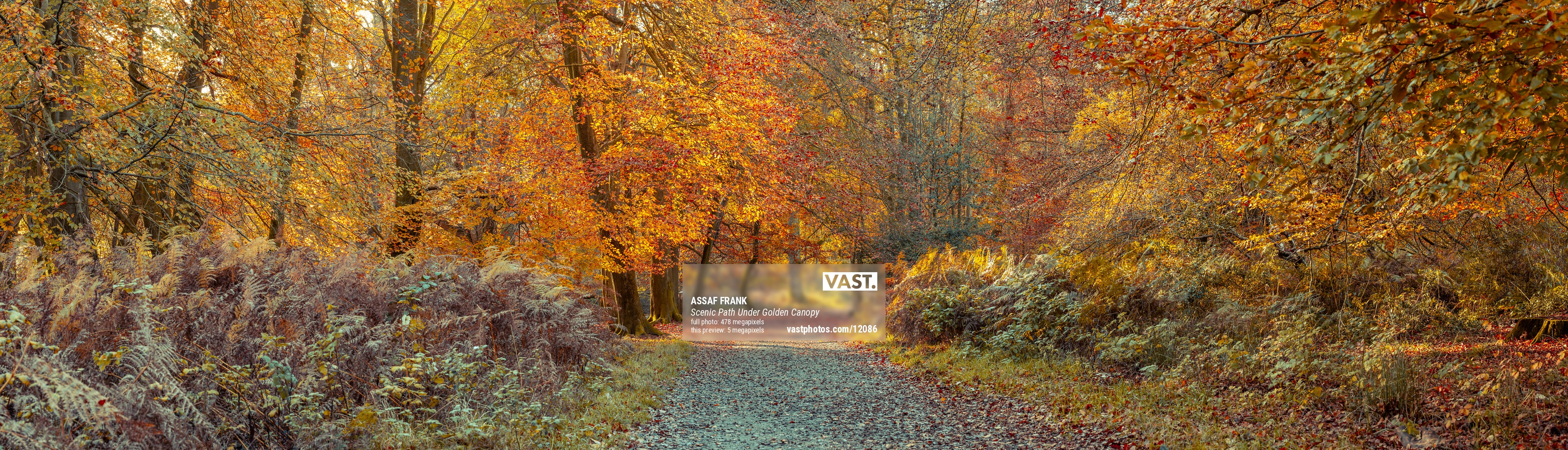 On either side of the trail, dense foliage and graceful ferns frame the pathway, adding texture and depth to the composition. The sunlight plays through the branches, casting a mesmerizing interplay of light and shadow that highlights the intricate details of the leaves and tree trunks. The soft golden glow, combined with the crisp autumn air, creates an atmosphere of serenity and quiet reflection, perfect for a peaceful walk or an escape into nature.
