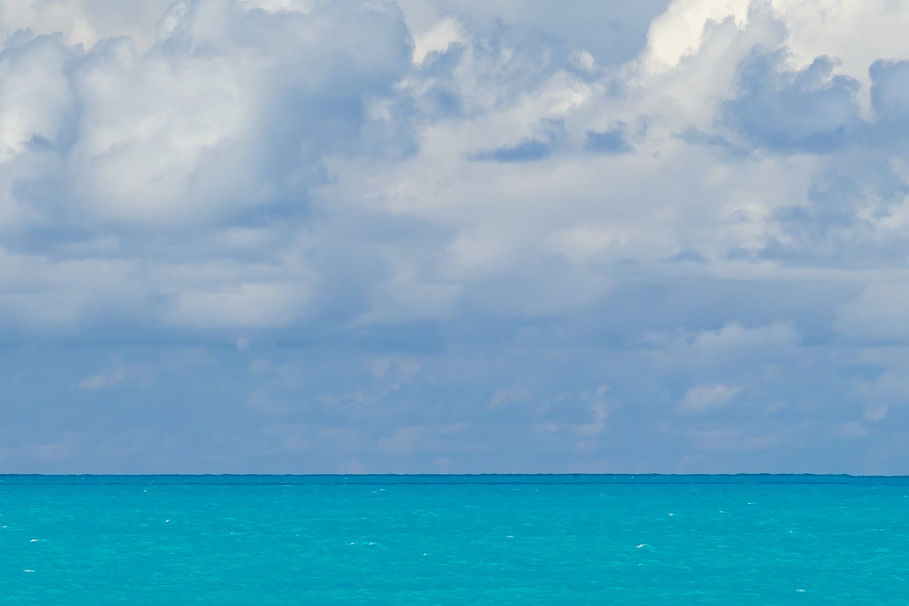 This panoramic photograph captures the stunning beauty of a tropical seascape, where vibrant turquoise waters stretch endlessly under a brilliant blue sky. Anchored peacefully on the serene ocean, a sleek sailboat with a blue canopy gently sways, embodying the essence of nautical leisure. The boat’s presence adds a charming focal point, inviting thoughts of relaxation and adventure.