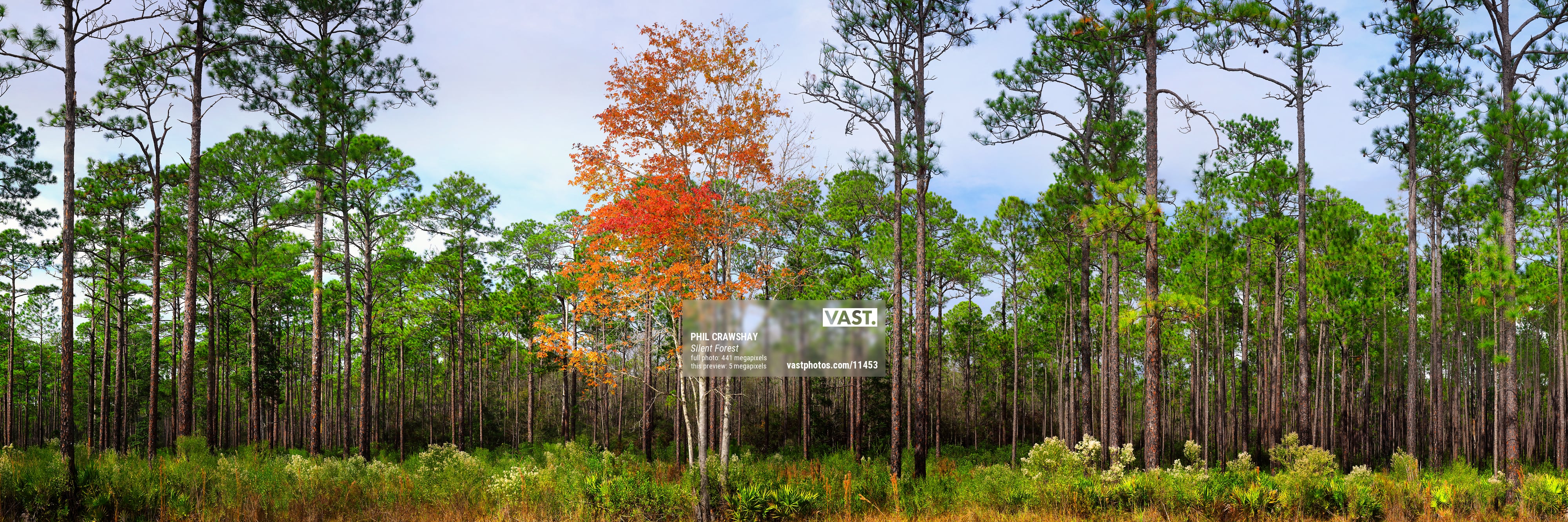 441 megapixels! A very high resolution, large-format VAST photo print of a forest with one autumn tree; nature photograph created by Phil Crawshay in Cary State Forest, Bryceville, Florida.