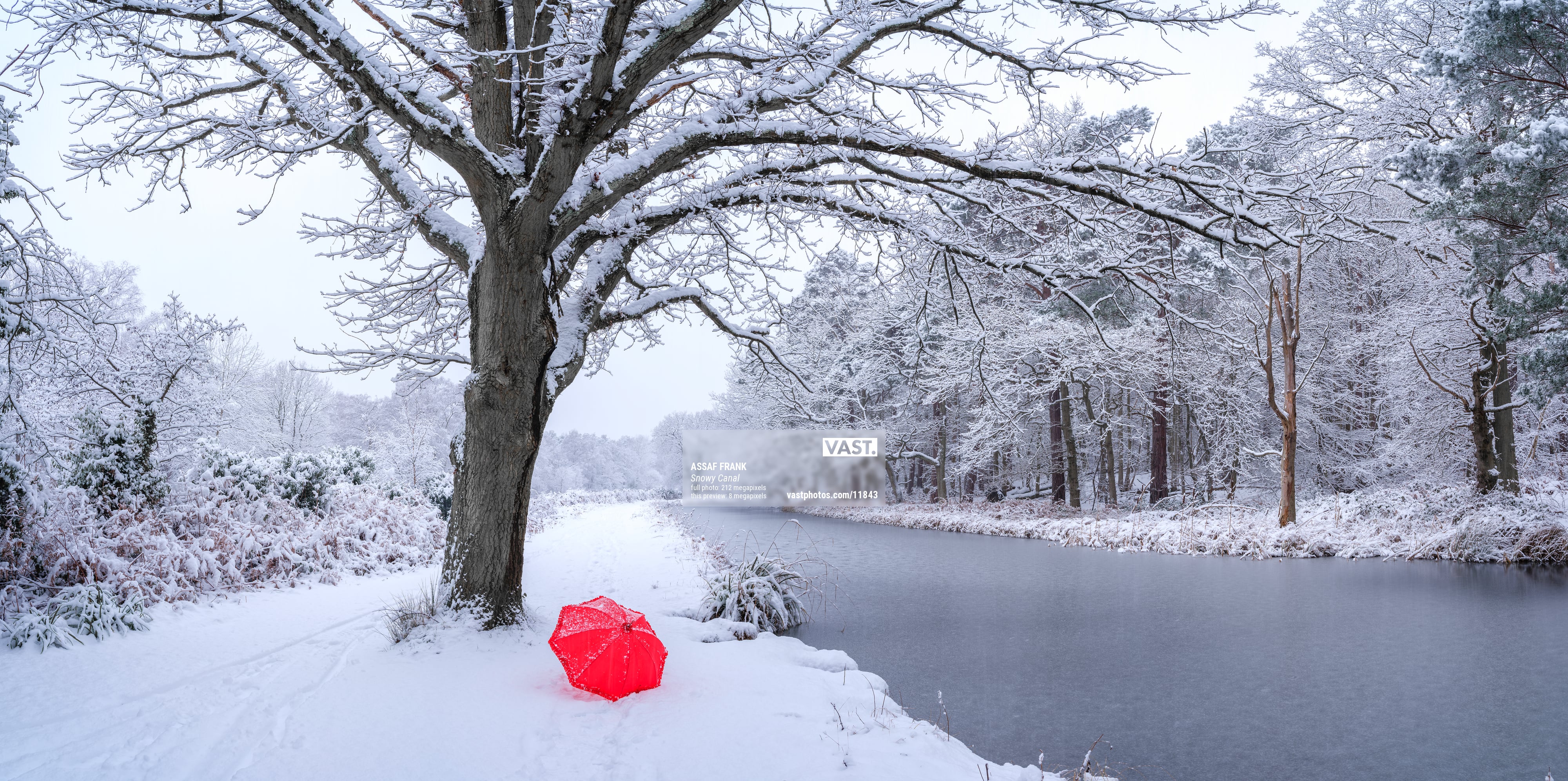 The composition expertly balances the natural elements with the bold pop of color, creating a harmonious and visually engaging image. This photograph beautifully encapsulates the peaceful and reflective mood of a snowy day by the canal, highlighting winter's simple yet profound beauty.