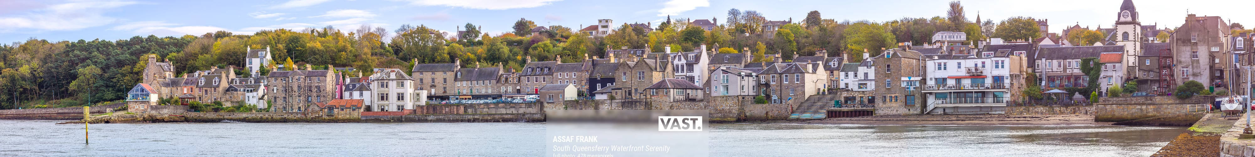 This panoramic image beautifully captures the charming waterfront of South Queensferry, Scotland. Nestled along the shores of the Firth of Forth, this historic town is known for its picturesque streets and captivating architecture. The stone buildings, many of which date back centuries, line the waterfront and create a harmonious blend of history and beauty. The scene is further enhanced by the lush greenery of the surrounding hills, providing a serene backdrop to the bustling waterfront.