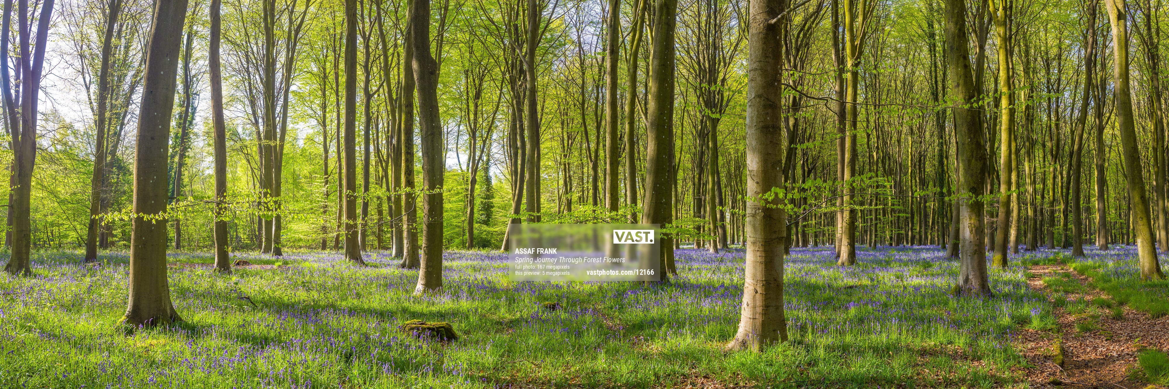 This panoramic image captures the enchanting tranquility of a bluebell forest in Hampshire, UK, during peak spring bloom. Towering, straight-trunked trees rise skyward, their newly sprouted leaves forming a soft green canopy that allows golden light to gently filter through. The forest floor is blanketed with a dense spread of vibrant bluebells, their purple-blue hues contrasting beautifully with the lush green undergrowth and the sturdy, dark bark of the trees.