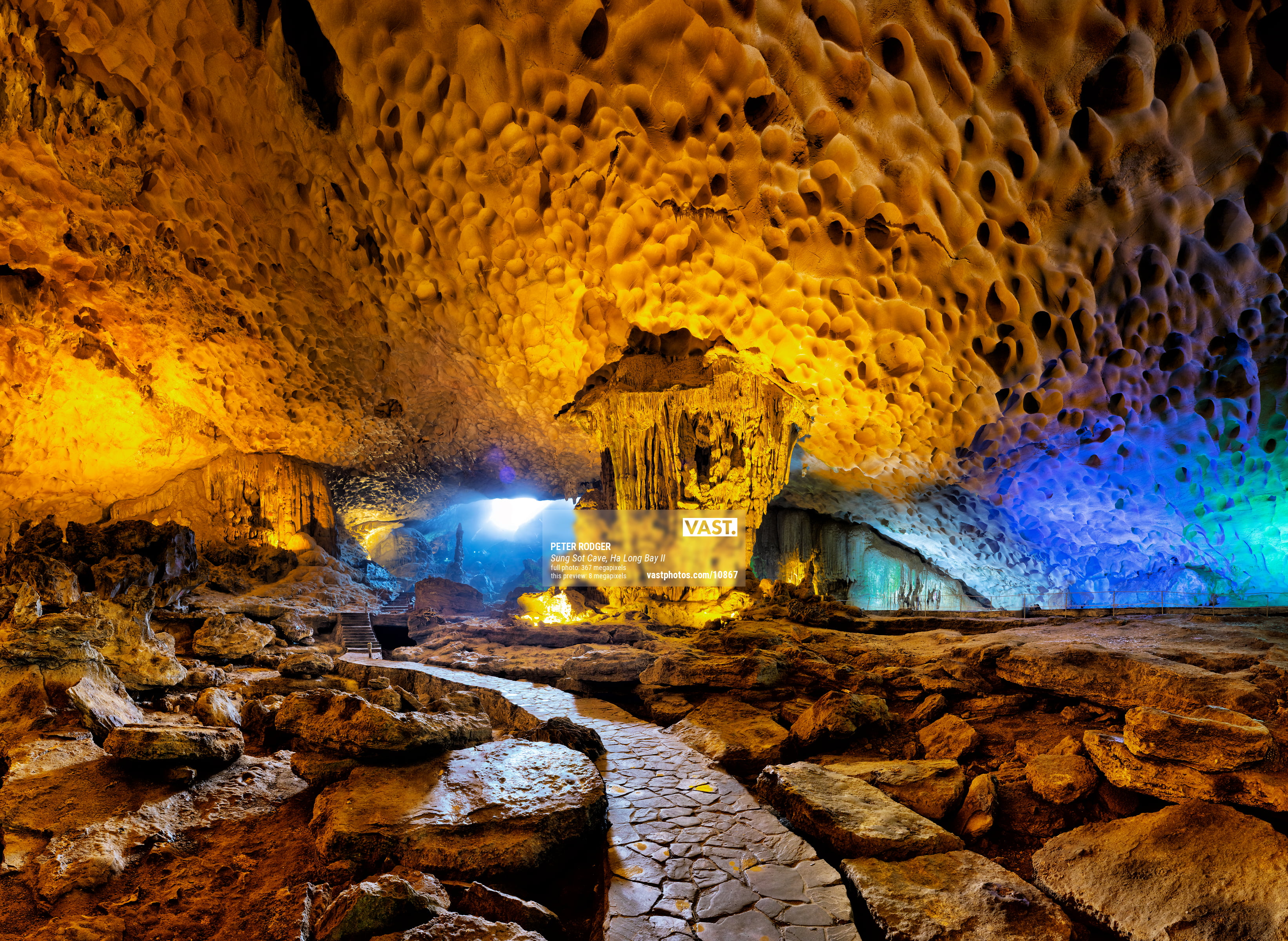367 megapixels! A very high resolution, wallpaper photo of a walkway in a cave; photograph created by Peter Rodger in Sung Sot Cave, Ha Long Bay, Vietnam.