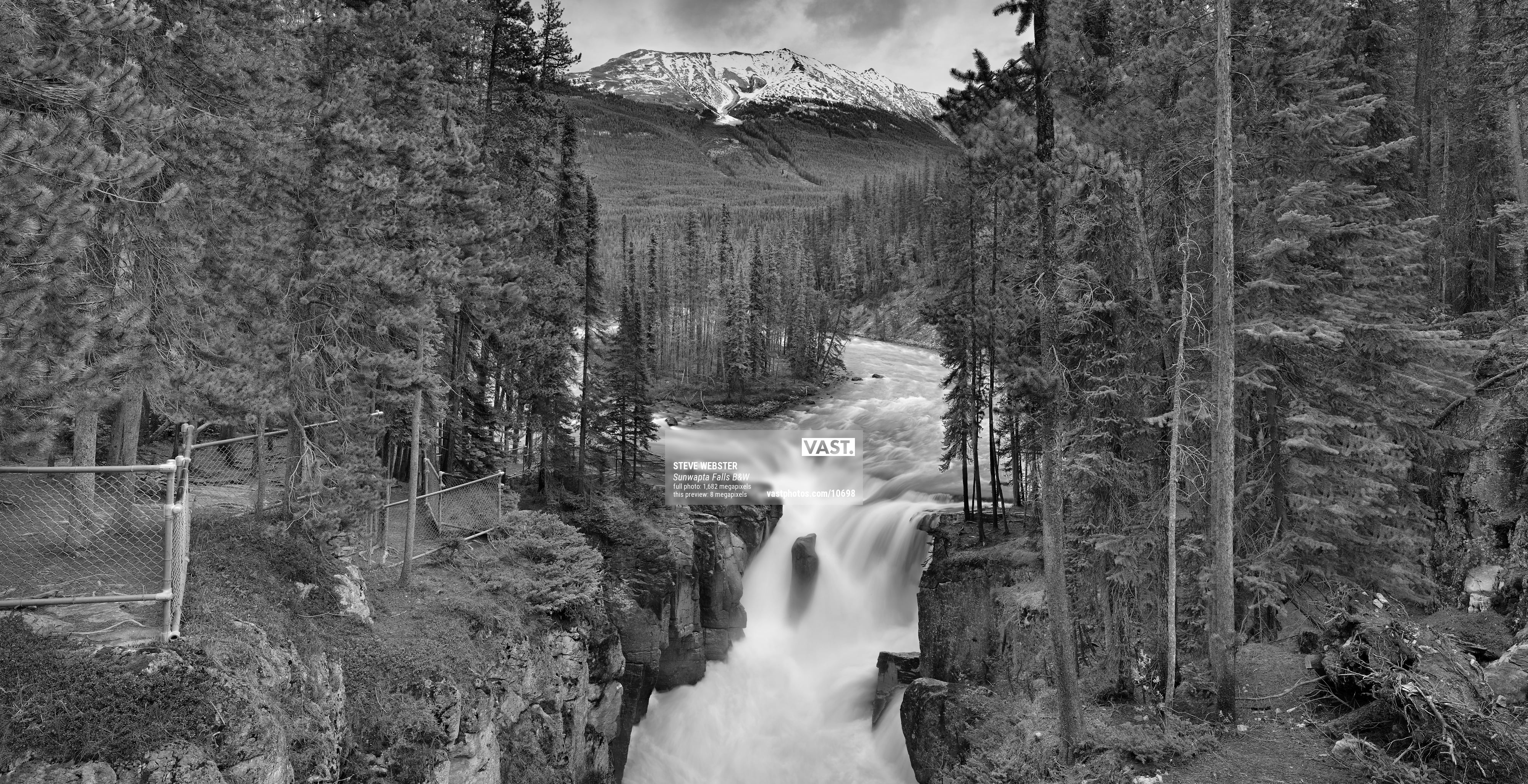 I shot this photograph from the bridge spanning the falls, over a period of several hours, in order to capture every last detail of this incredible scene. From icy mountain tops, down to the base of the falls, this image beautifully depicts the timeless majesty of Sunwapta Falls.