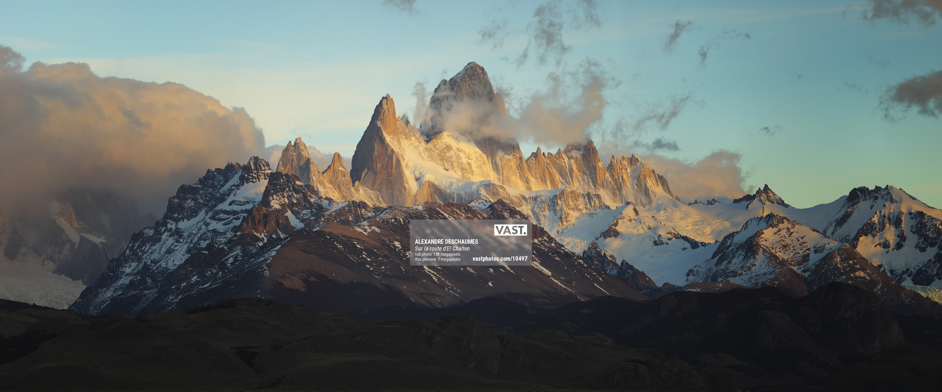 Early morning on the road to El Chalten, Argentina, Patagonia. The sun is rising just on the fortress peaks and here I like the gentle mix of soft light and shadows bringing the atmosphere.