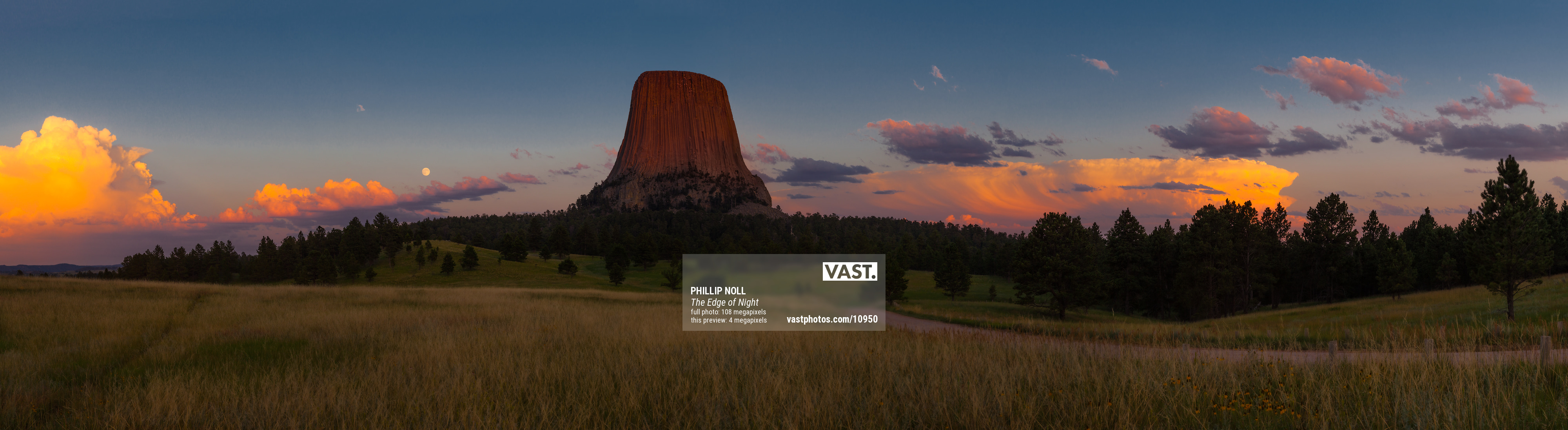 The last light of day warms Devils Tower with red alpenglow as the moon rises behind distant thunderstorms.