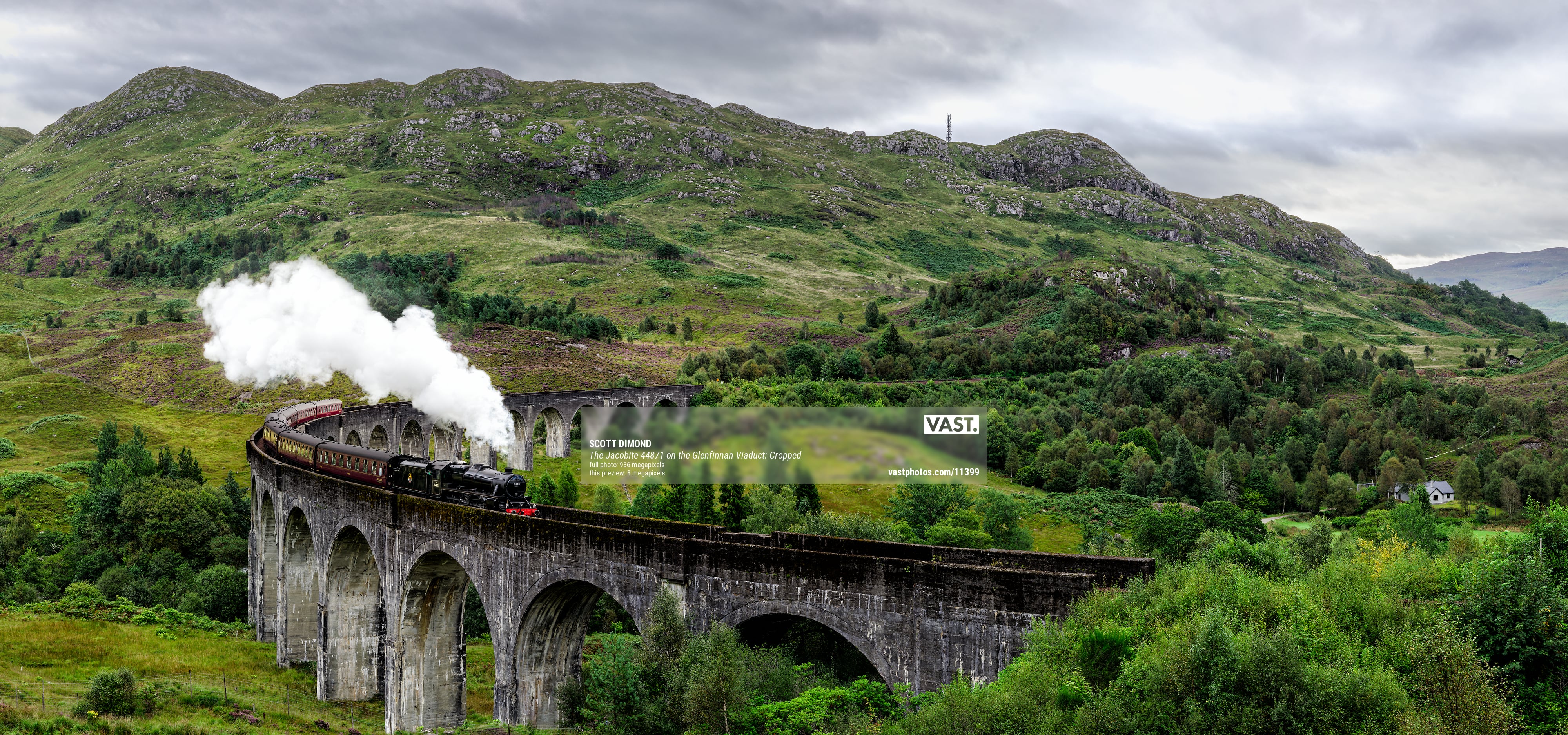 One such location on my list was the famous Jacobite Steam Train crossing the equally famous Glenfinnan Viaduct. Since the Harry Potter movies, the site has become a popular tourist stop and has been photographed endlessly but what I have never seen was an ultra-high-resolution image with a train on the viaduct. So that was my quest. A “regular” photo or “regular” panoramic would not do. But unlike a static mountain or meadow, where the digital camera is repositioned across the scene with overlapping photos taken at each position and then later stitched together, this scene would present a new challenge with a train racing through it. The train needed to be captured in its entirety with its motion frozen. Shooting the entire scene in a single exposure on film was one option but I did not plan on hauling my large panoramic film camera to Scotland and even then, it would not capture the scene with the ultra-high-resolution I was looking for. So, in the weeks before my trip began, I formulated a plan on how I hoped to pull off the inclusion of the speeding train. On the day in question, I arrived early and scouted for the best location to create my VAST photo. I then got to work setting up the special equipment needed and photographing the entire scene without a train. Once completed, I prepared for the train’s arrival. The train passes over the viaduct each morning at around 10:40 am. I would have just one chance to capture the train in a way that it could be seamlessly incorporated into the hundreds and hundreds of other photos I had already taken to create one ultra-high-resolution photo. If it did not work out, I would have a lovely ultra-high-resolution photo of an empty viaduct. But as the results show, my quest was successful.
