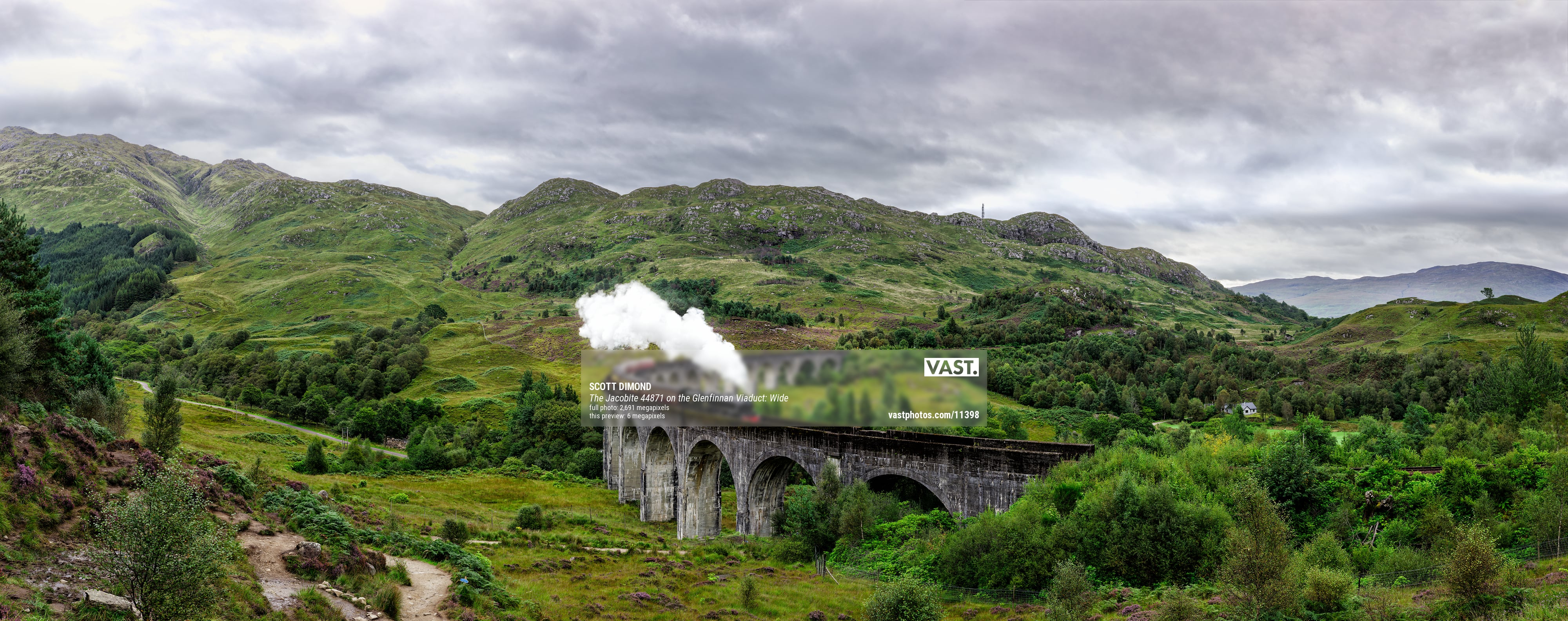 One such location on my list was the famous Jacobite Steam Train crossing the equally famous Glenfinnan Viaduct. Since the Harry Potter movies, the site has become a popular tourist stop and has been photographed endlessly but what I have never seen was an ultra-high-resolution image with a train on the viaduct. So that was my quest. A “regular” photo or “regular” panoramic would not do. But unlike a static mountain or meadow, where the digital camera is repositioned across the scene with overlapping photos taken at each position and then later stitched together, this scene would present a new challenge with a train racing through it. The train needed to be captured in its entirety with its motion frozen. Shooting the entire scene in a single exposure on film was one option but I did not plan on hauling my large panoramic film camera to Scotland and even then, it would not capture the scene with the ultra-high-resolution I was looking for. So, in the weeks before my trip began, I formulated a plan on how I hoped to pull off the inclusion of the speeding train. On the day in question, I arrived early and scouted for the best location to create my VAST photo. I then got to work setting up the special equipment needed and photographing the entire scene without a train. Once completed, I prepared for the train’s arrival. The train passes over the viaduct each morning at around 10:40 am. I would have just one chance to capture the train in a way that it could be seamlessly incorporated into the hundreds and hundreds of other photos I had already taken to create one ultra-high-resolution photo. If it did not work out, I would have a lovely ultra-high-resolution photo of an empty viaduct. But as the results show, my quest was successful.