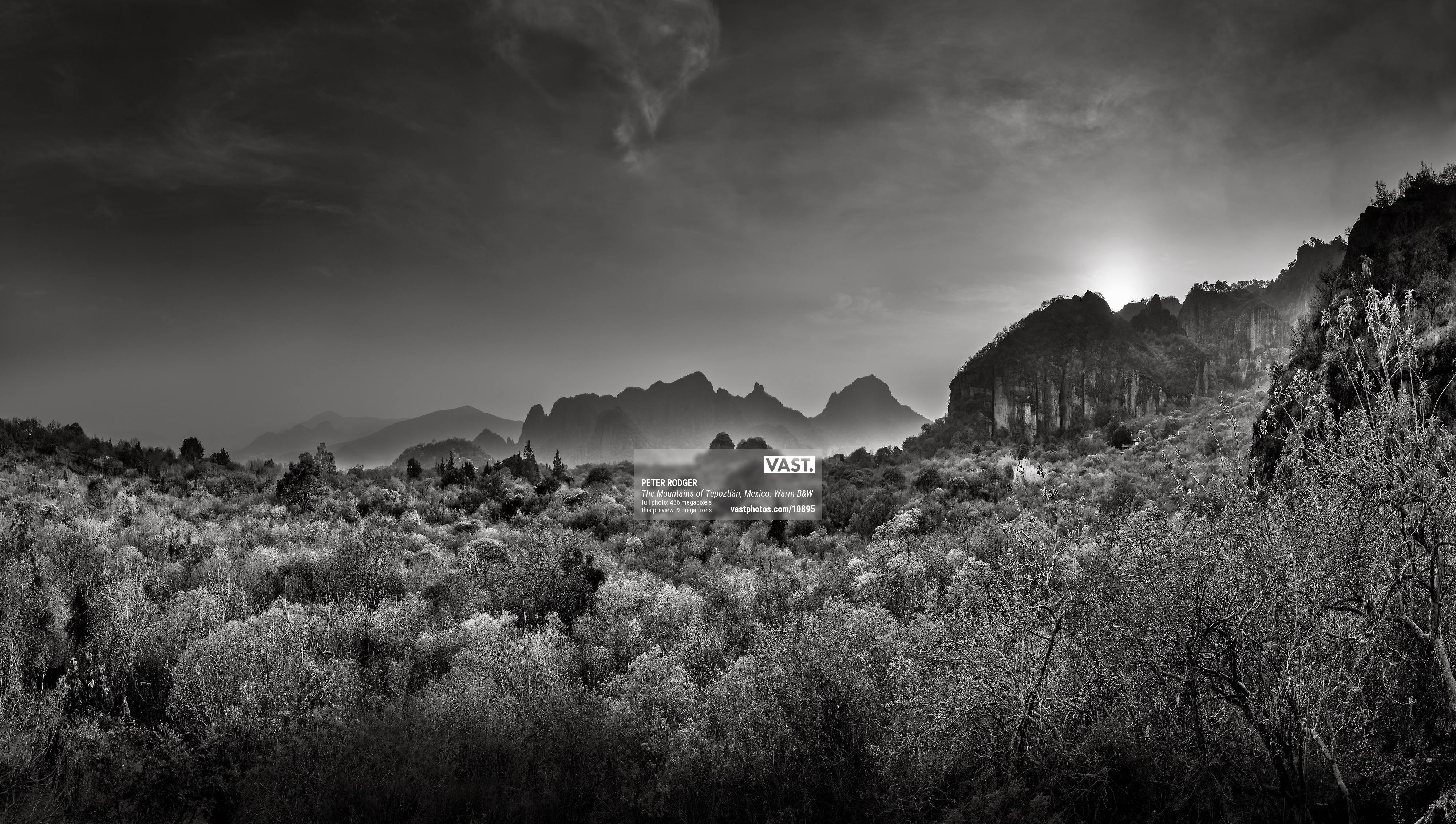 A close-up of "The Mountains of Tepoztlán, Mexico: Warm B&W" by Peter Rodger: an ultra-high-resolution VAST photo.