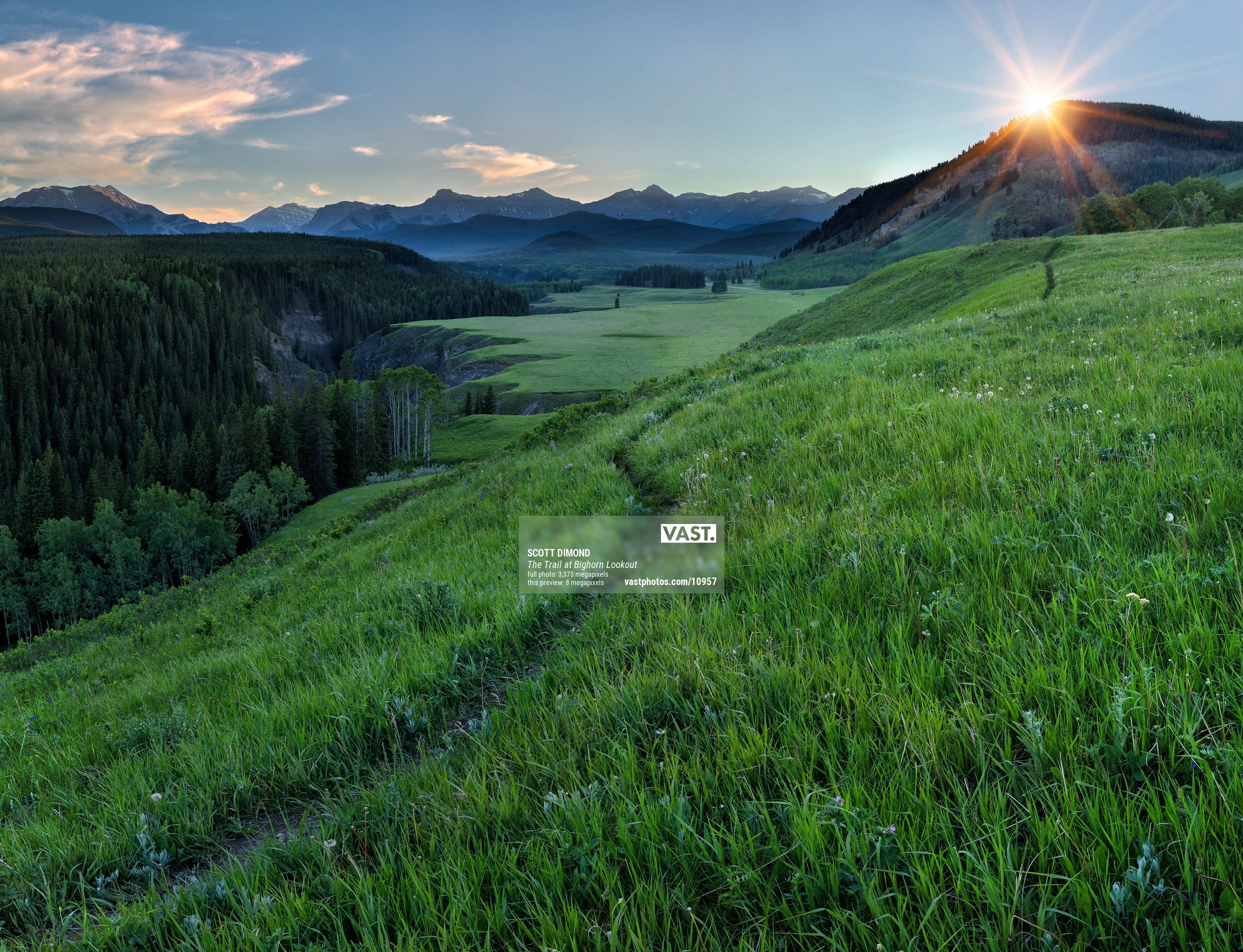 On a warm June evening, I drove out to the Bighorn Lookout hoping to capture a wonderful view of the Bighorn Sheep Meadow and the mountains beyond. Upon arrival, I met a couple that had just packed up a late evening picnic. As they walked past me and we exchanged pleasantries, I admired their lovely wicker picnic basket and checkerboard blanket. Although they gave me no indication that such was the case, as I looked out at the view they had just enjoyed in solitude, I could imagine it would have been a perfect time and place to propose. Moments later they were gone, and I had the entire view to myself. Not a soul in sight. Just me, the Sheep River valley to my left, the lush open Bighorn Sheep Meadows front and center, and the Canadian Rockies in the distance. As the sun slowly sank, I set up my specialized equipment to capture the scene in ultra-high resolution. I decided to make the trail along the lookout a key feature of the image allowing the viewer to imagine walking the trail, enjoying the fresh air, and exploring the area for the long hours of evening daylight that always lingers at this time of year.