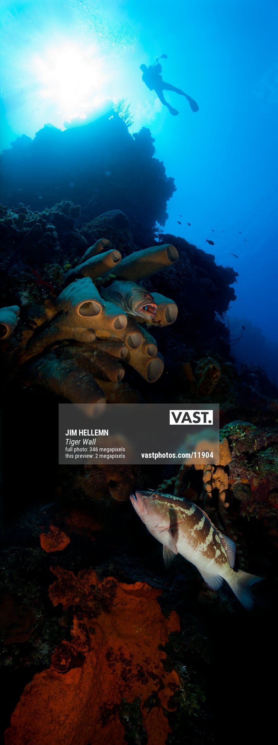 A Nassau Grouper looms in the foreground and a diver looks down from above as a Tiger Grouper rests at a “cleaning station”, being groomed by Yellow Stripe Gobies, Fairy Basslets and cleaner shrimp. The Nassau is being cleaned too, a common site on the steep coral reef walls at Bloody Bay Marine Park in Little Cayman.